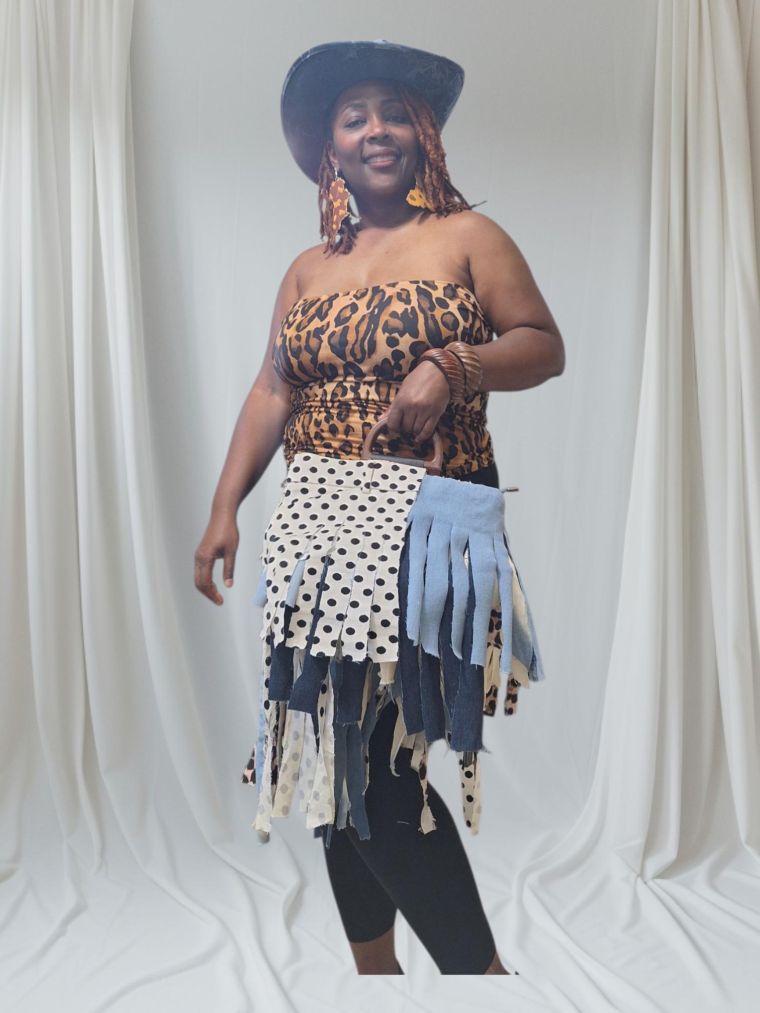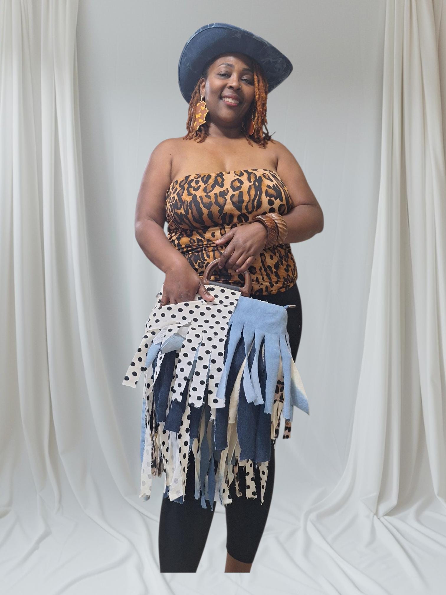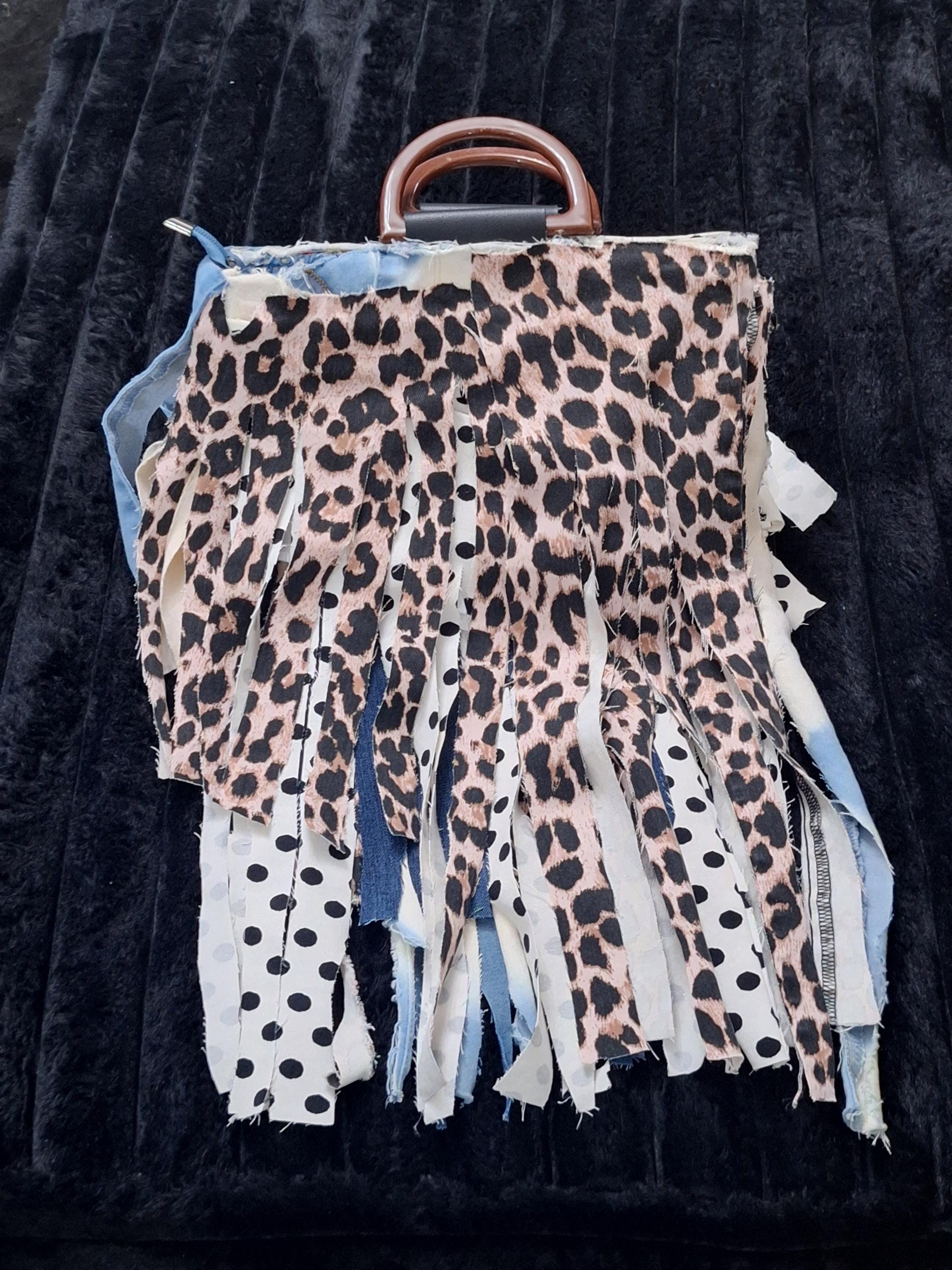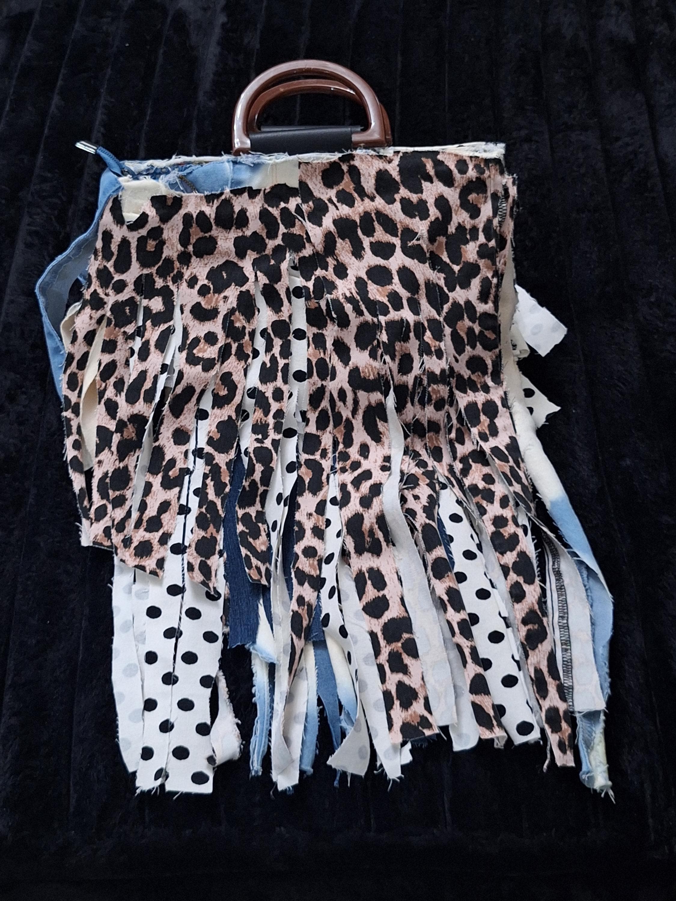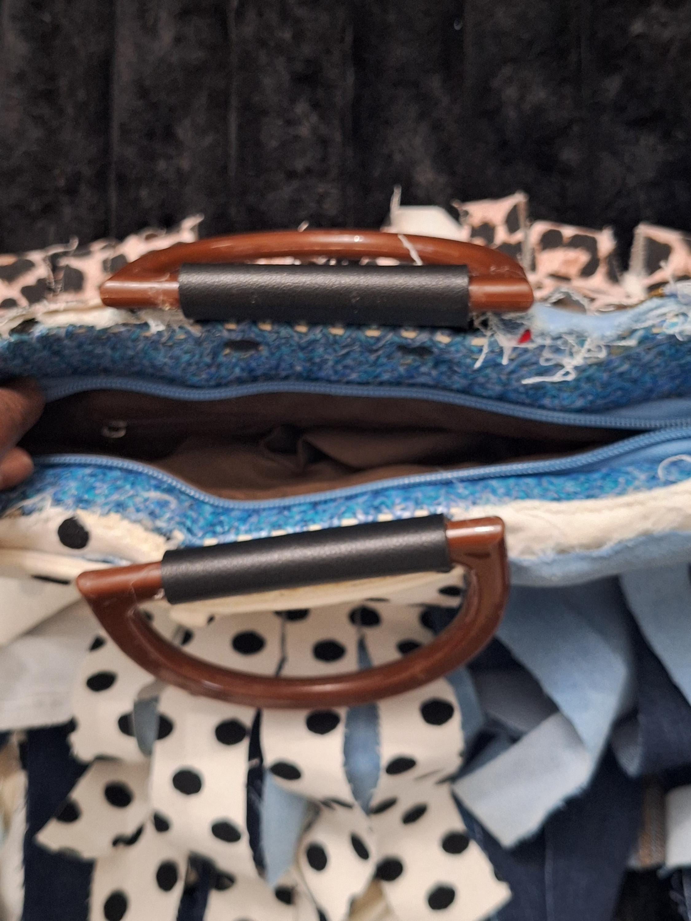 This is a handmade denim mixed, upcycled and revamped handbag. It is made using bleached denim jeans and upcycled handbag with matching dangle earrings included.