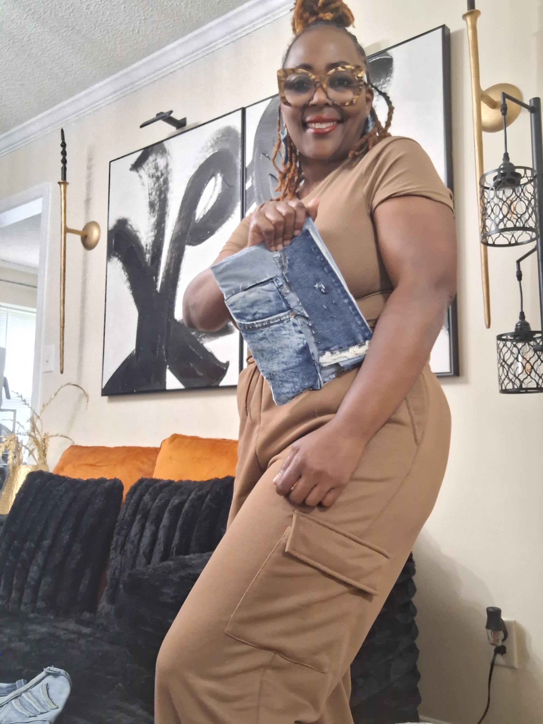This is a handmade denim mixed, upcycled clutch. It is made using bleached denim jeans with matching dangle earrings incuded.