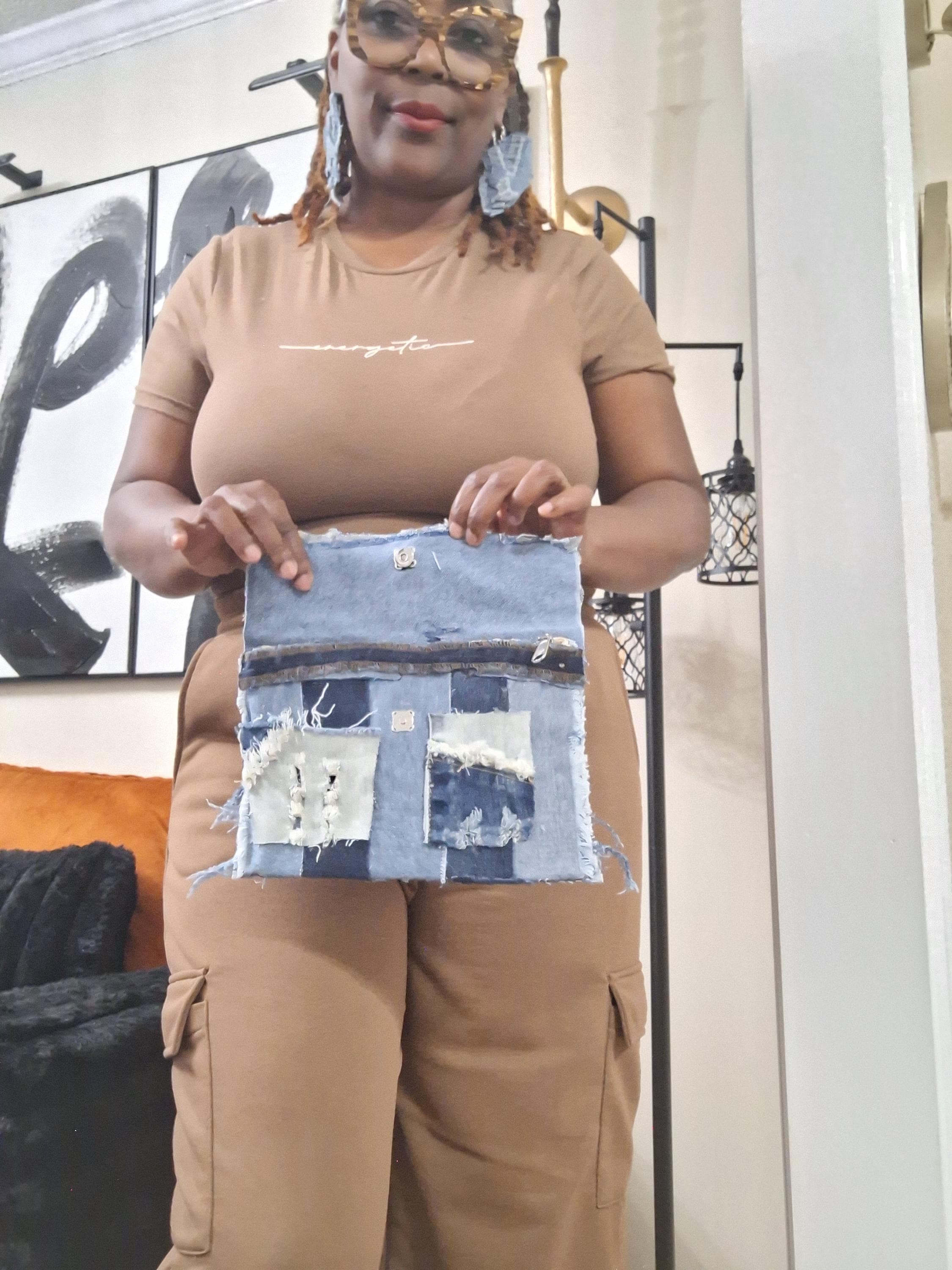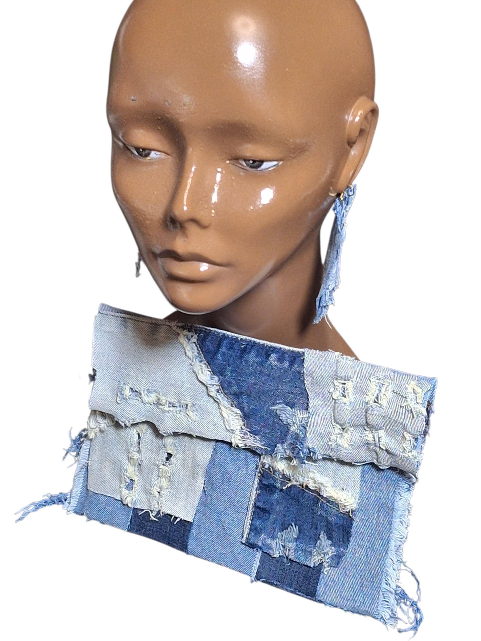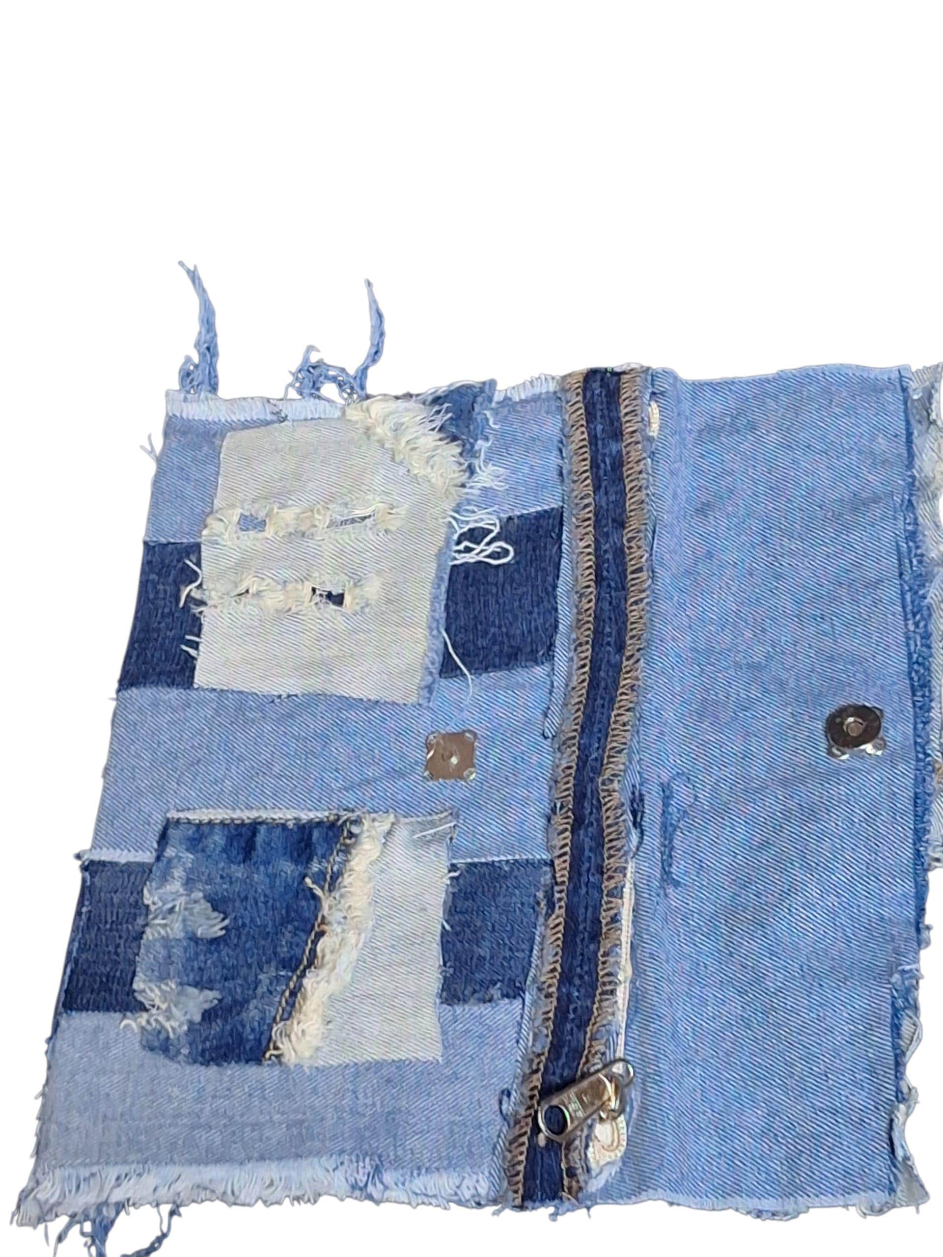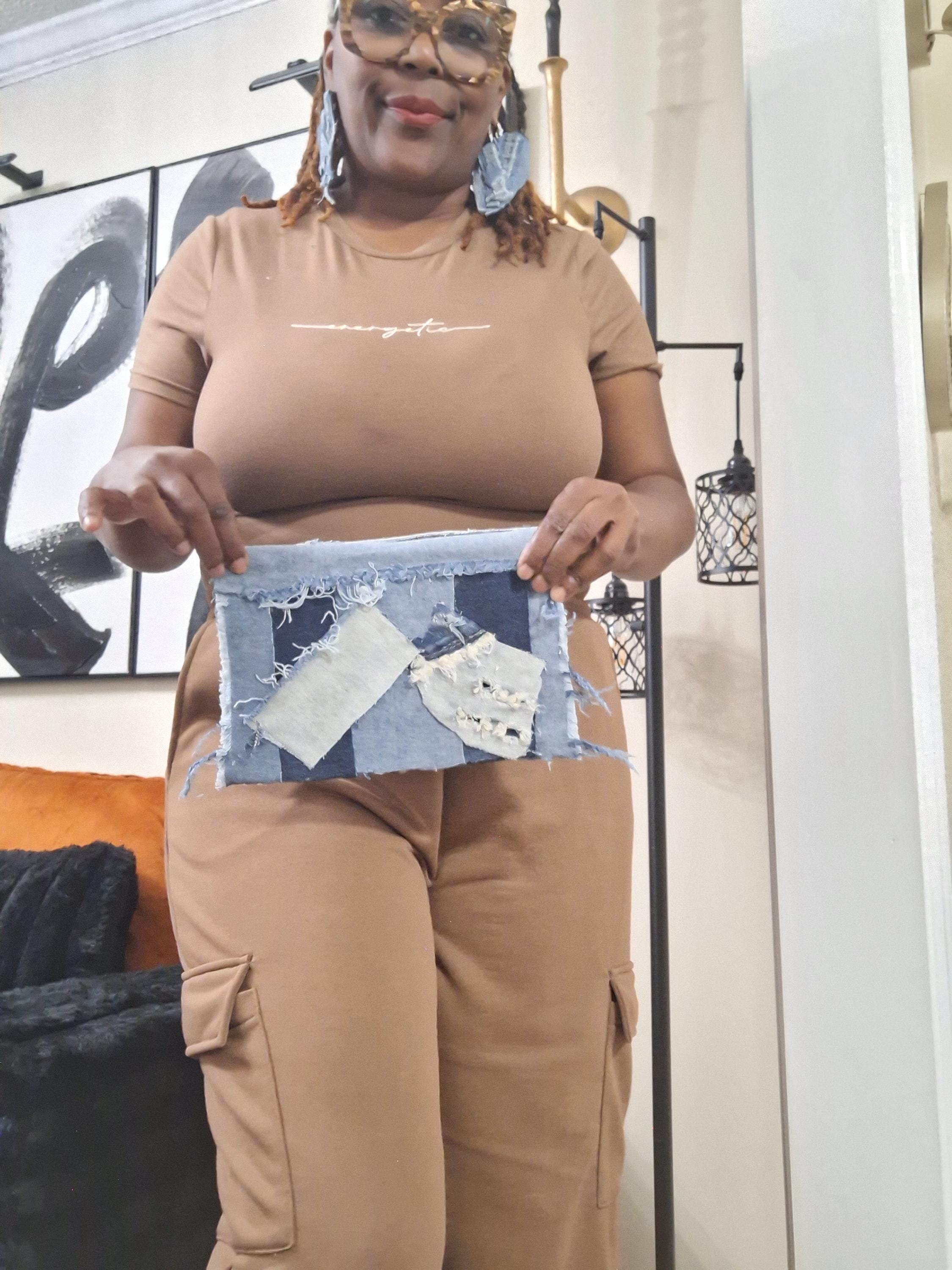 This is a handmade denim mixed, upcycled clutch. It is made using bleached denim jeans with matching dangle earrings incuded.