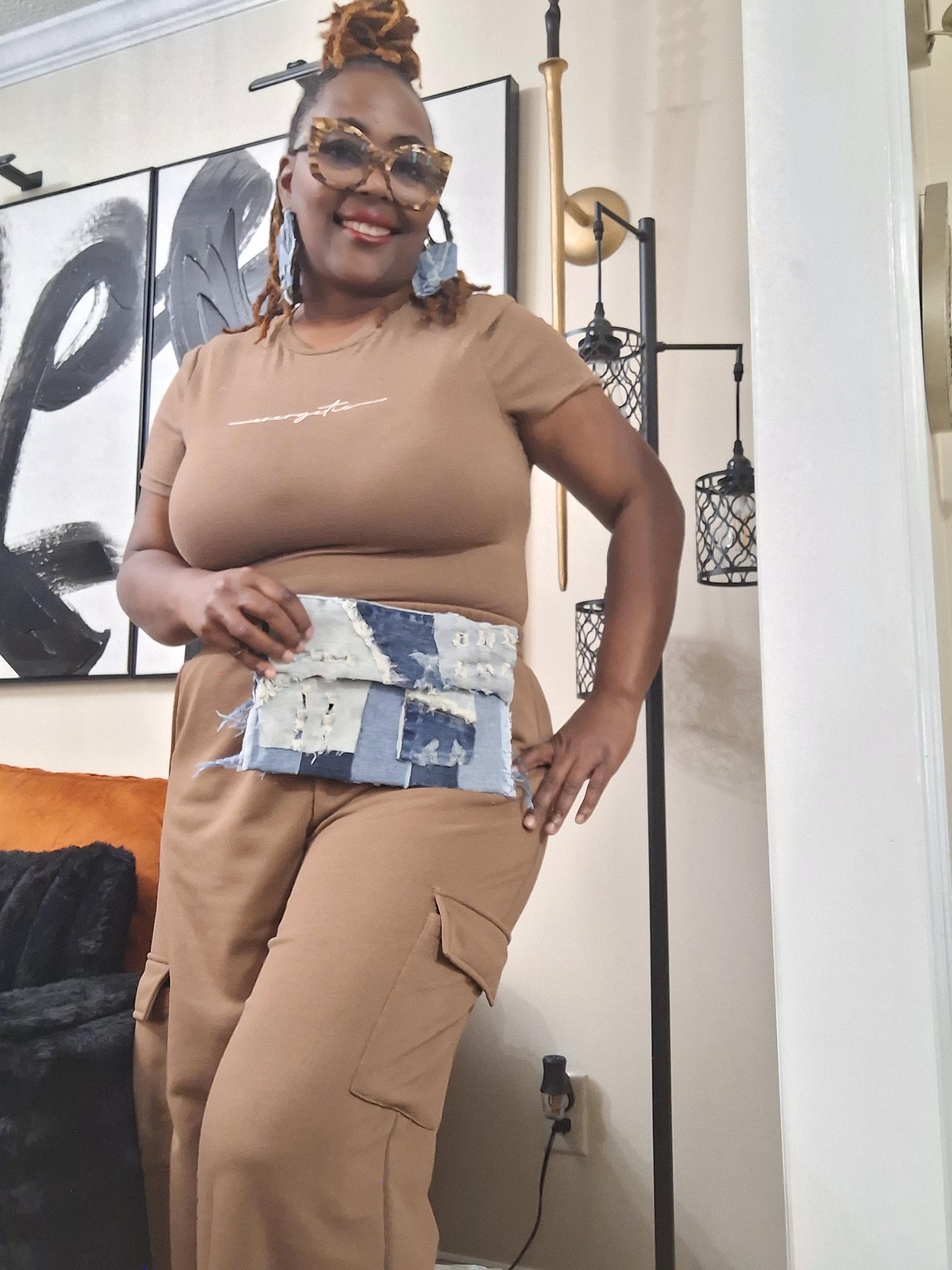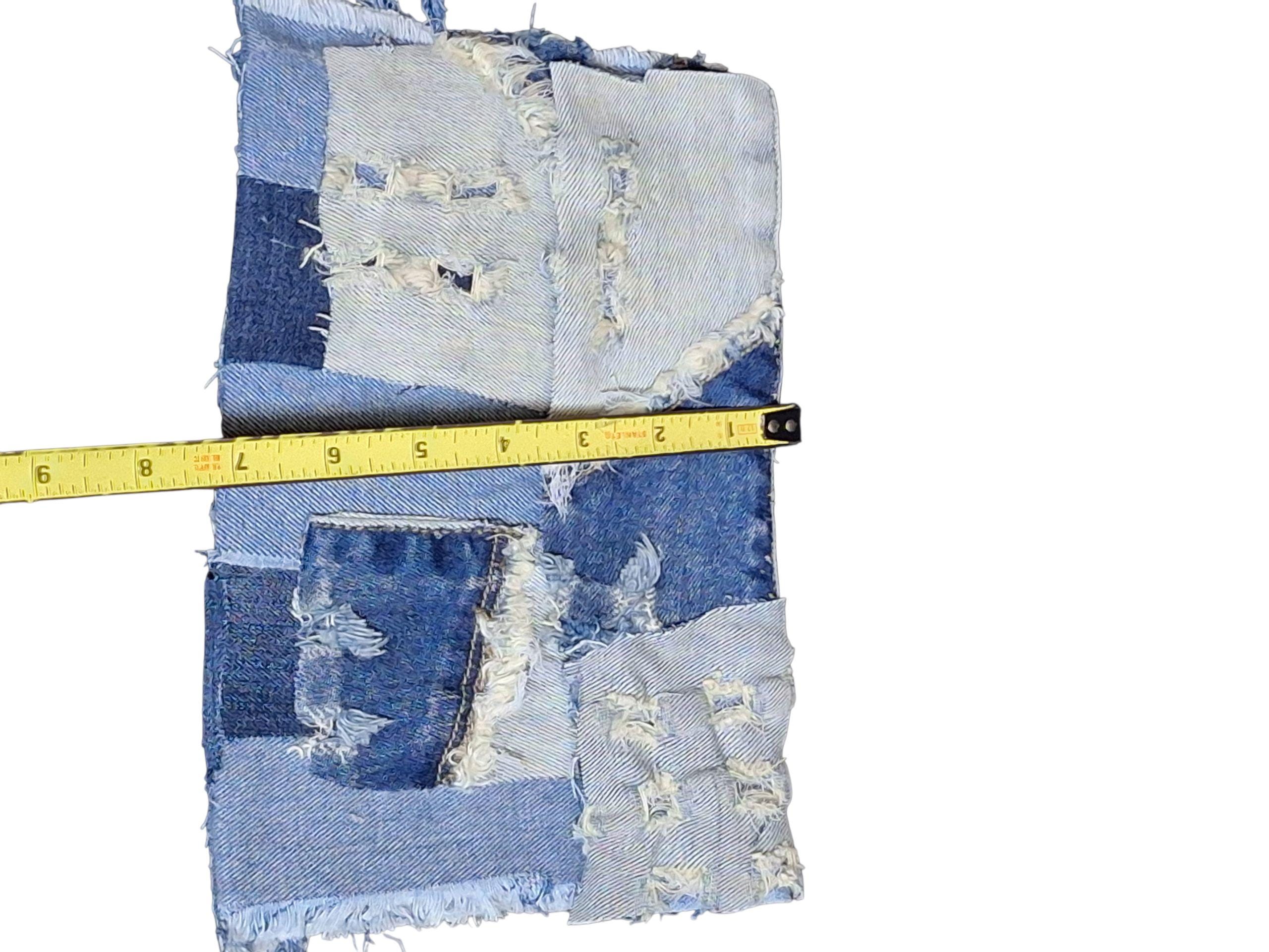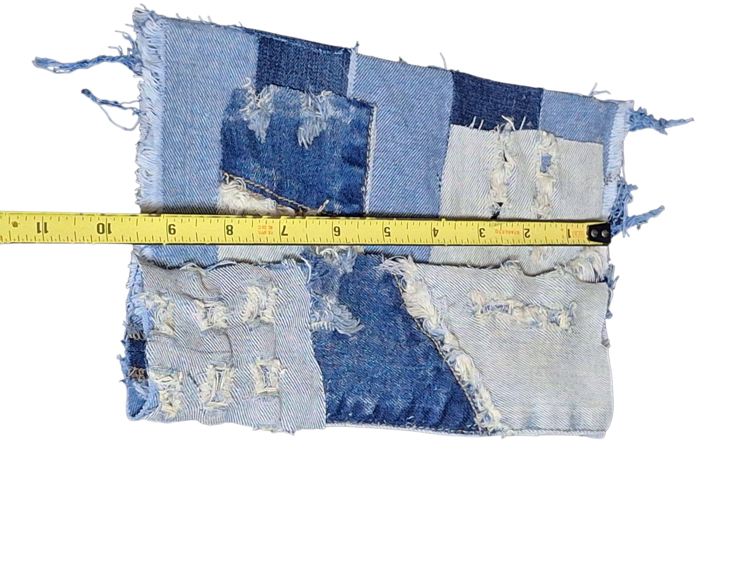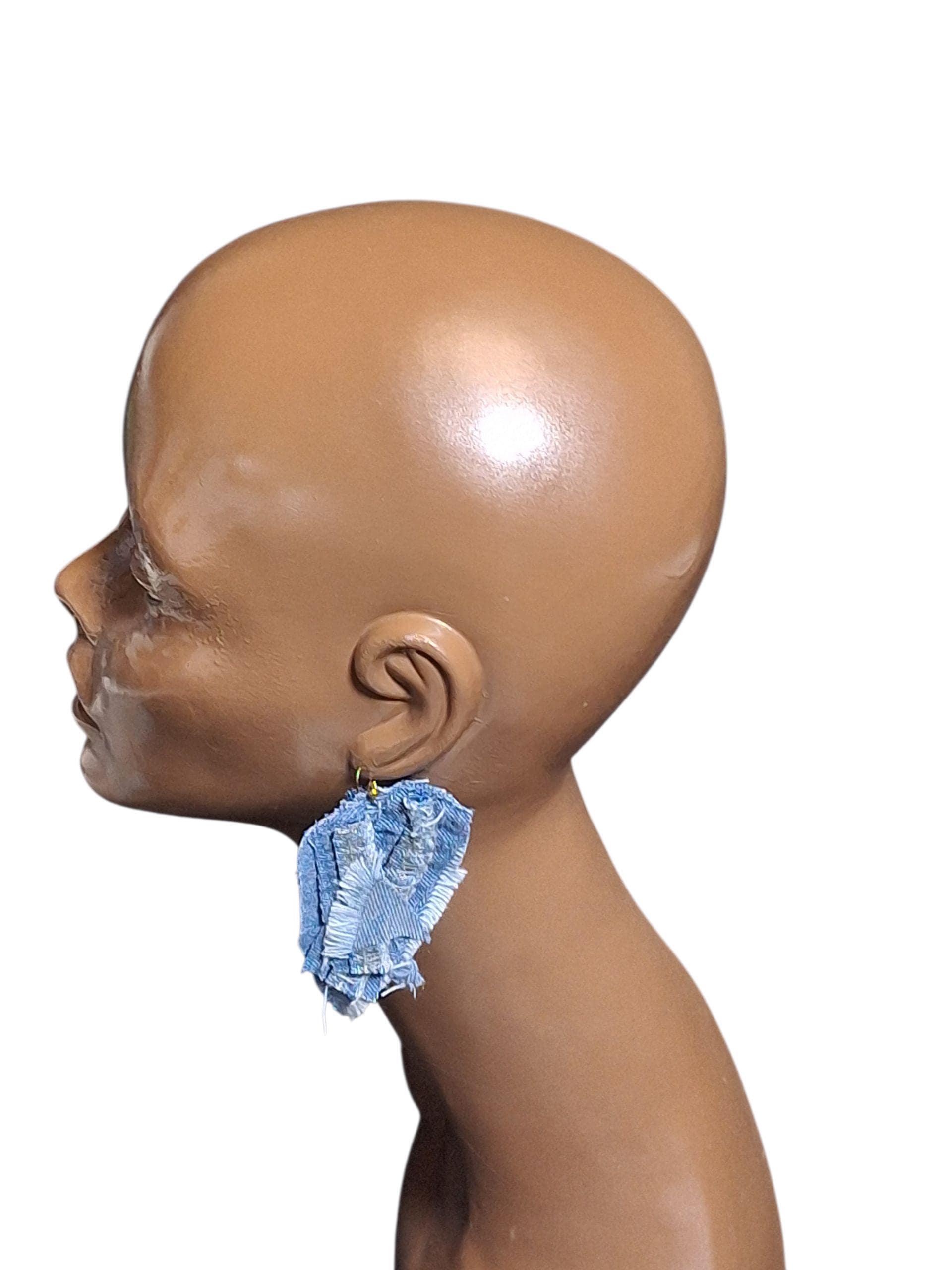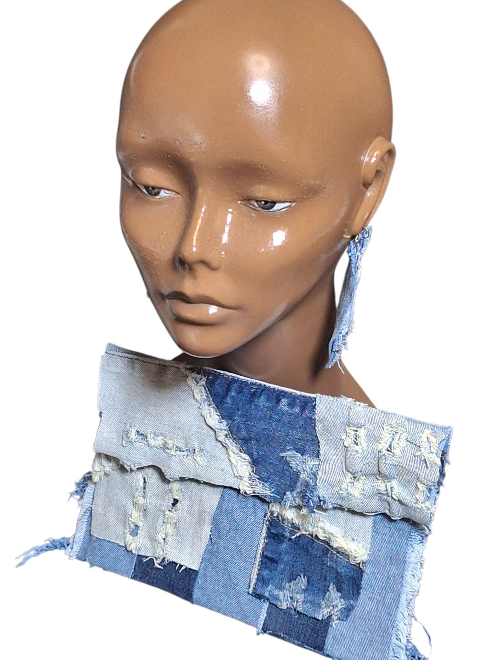 This is a handmade denim mixed, upcycled clutch. It is made using bleached denim jeans with matching dangle earrings incuded.