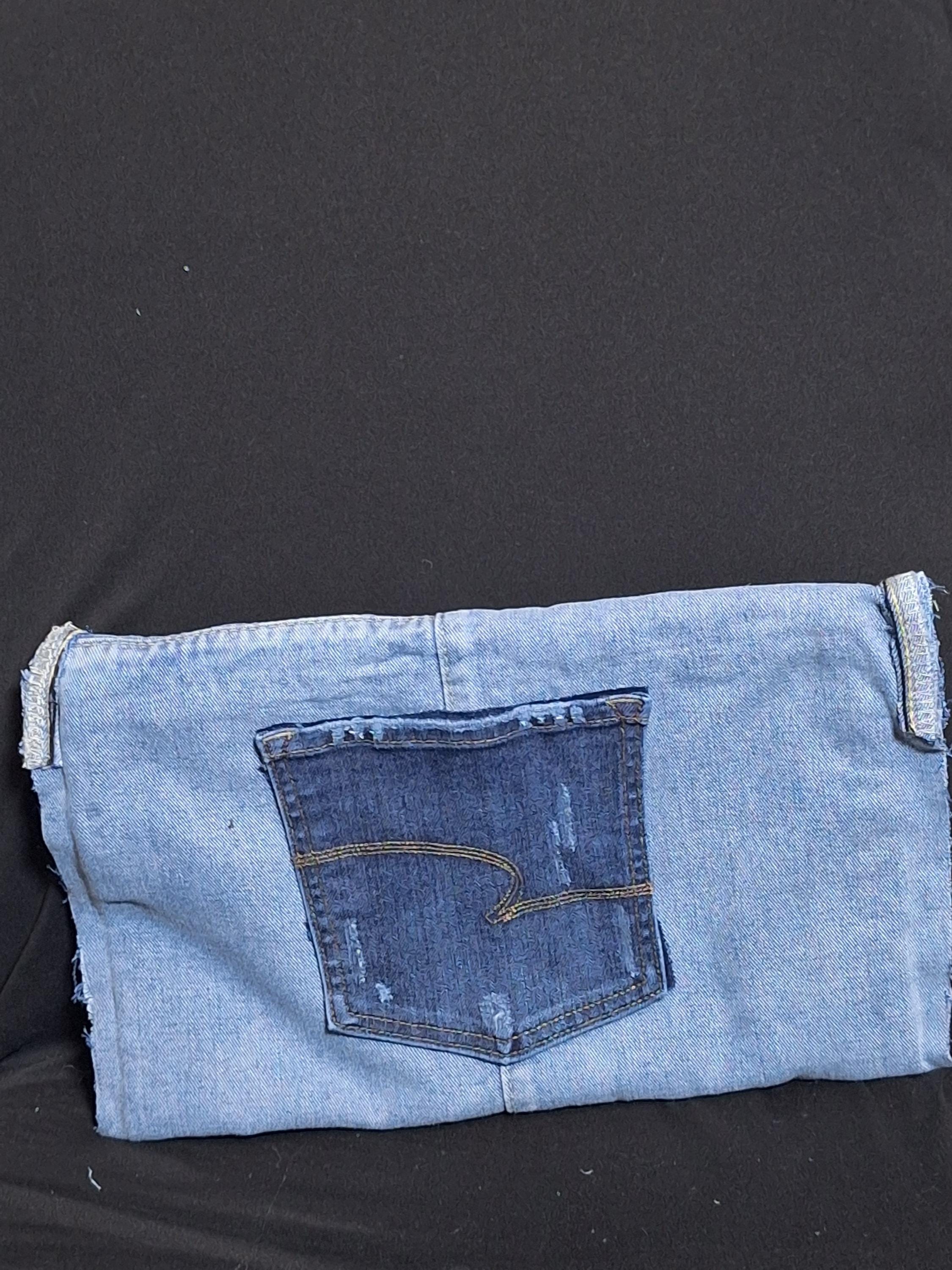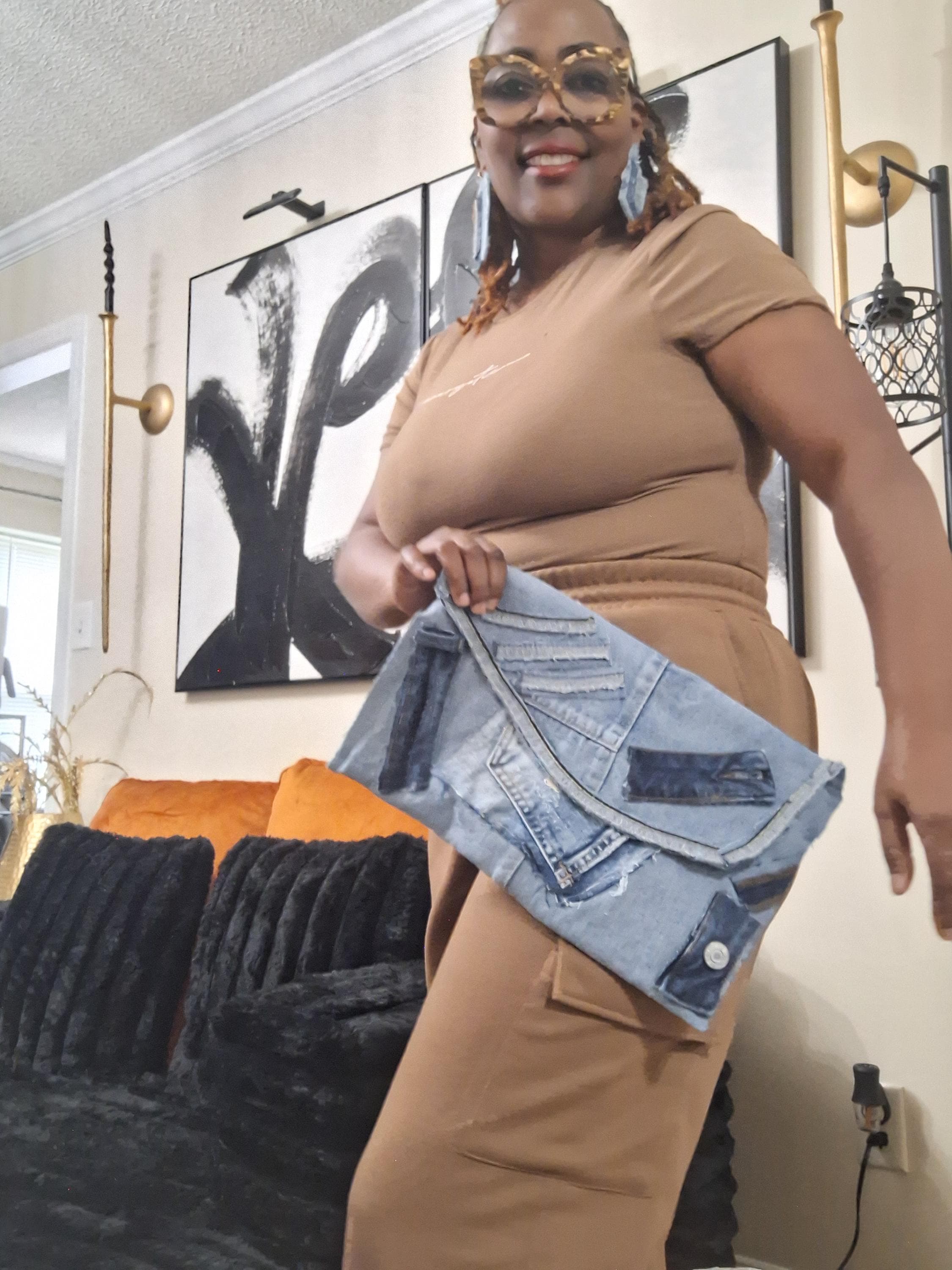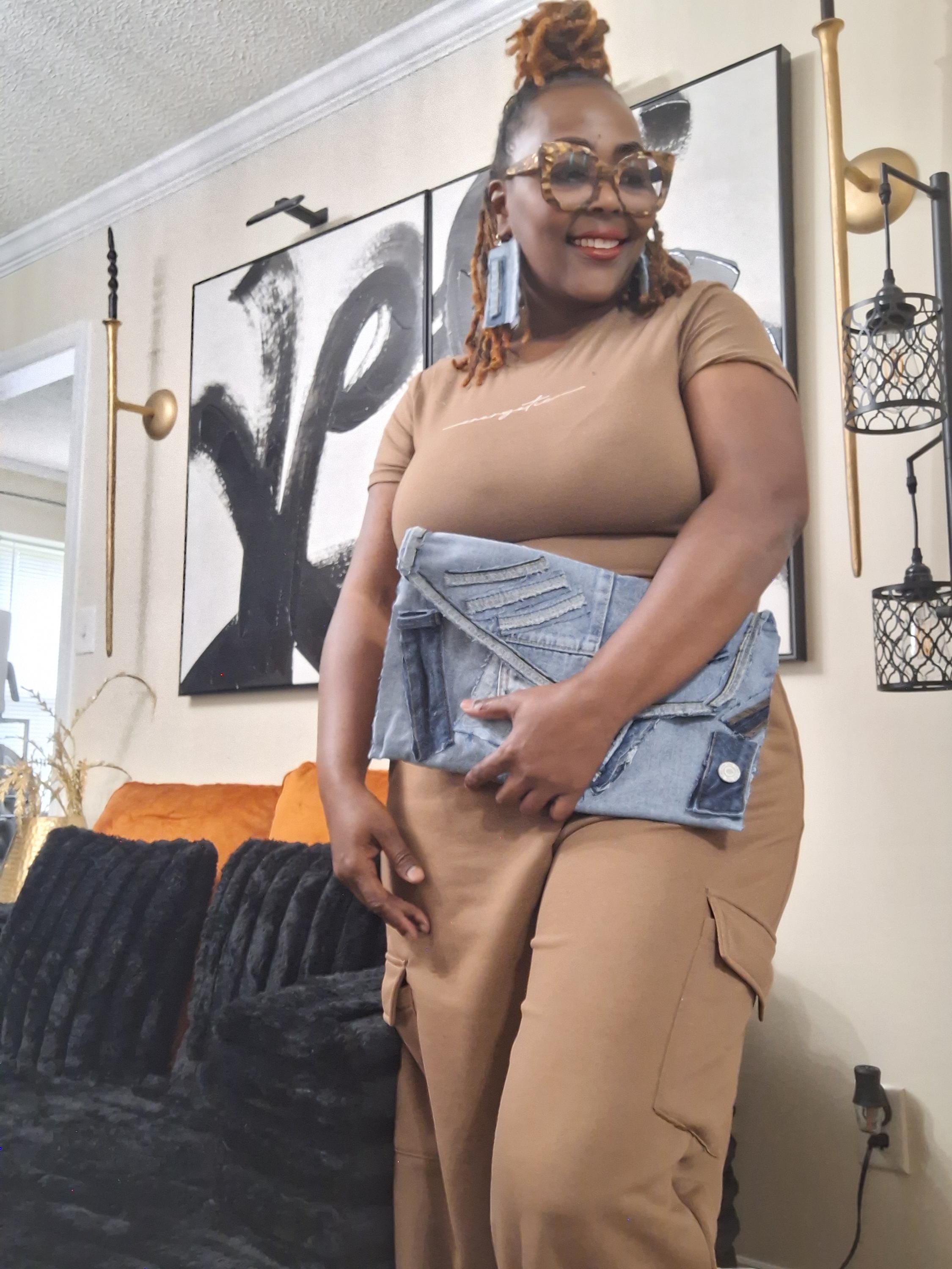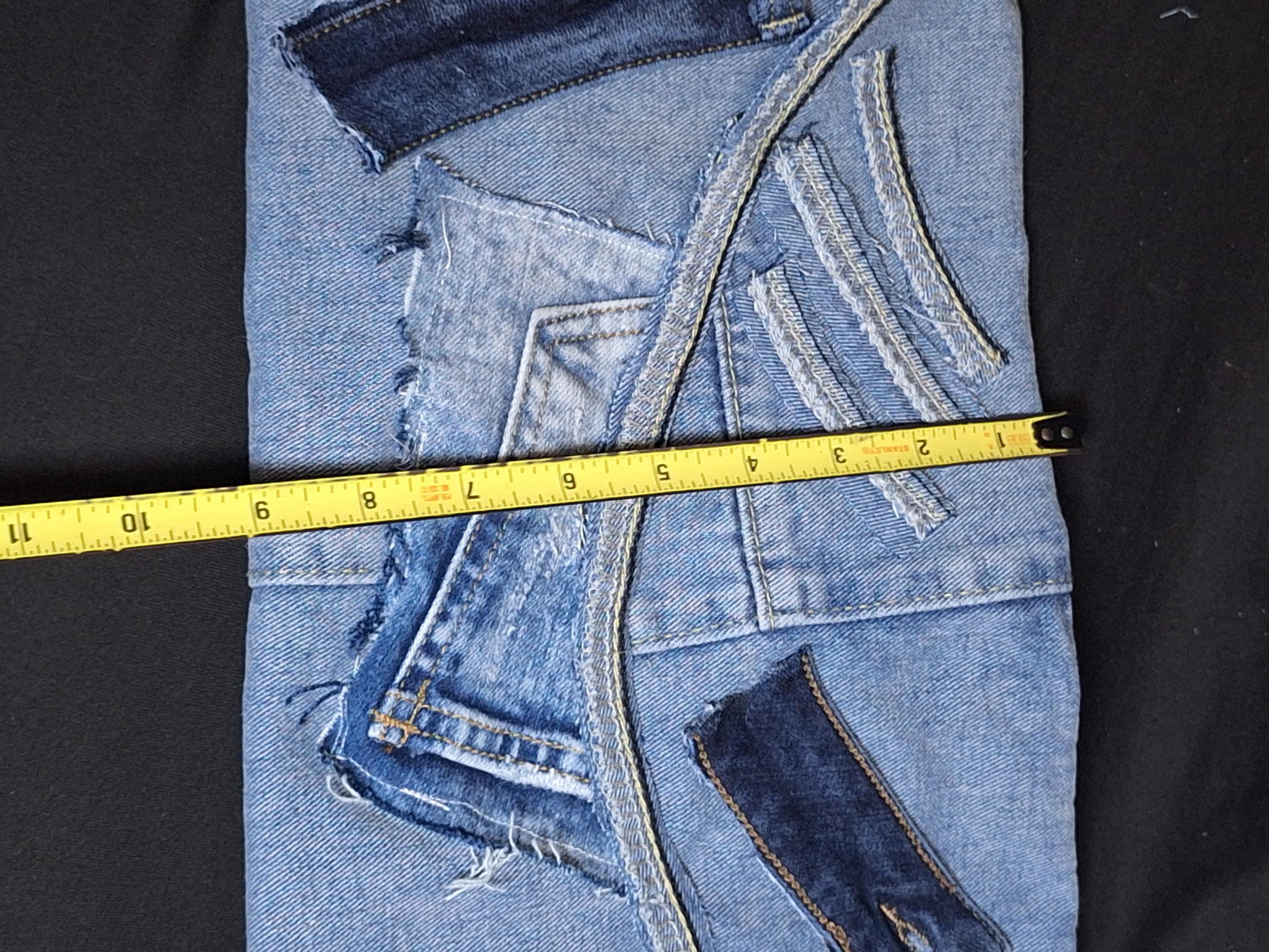 This is a handmade denim mixed, upcycled clutch. It is made using bleached denim jeans with matching dangle earrings incuded.
