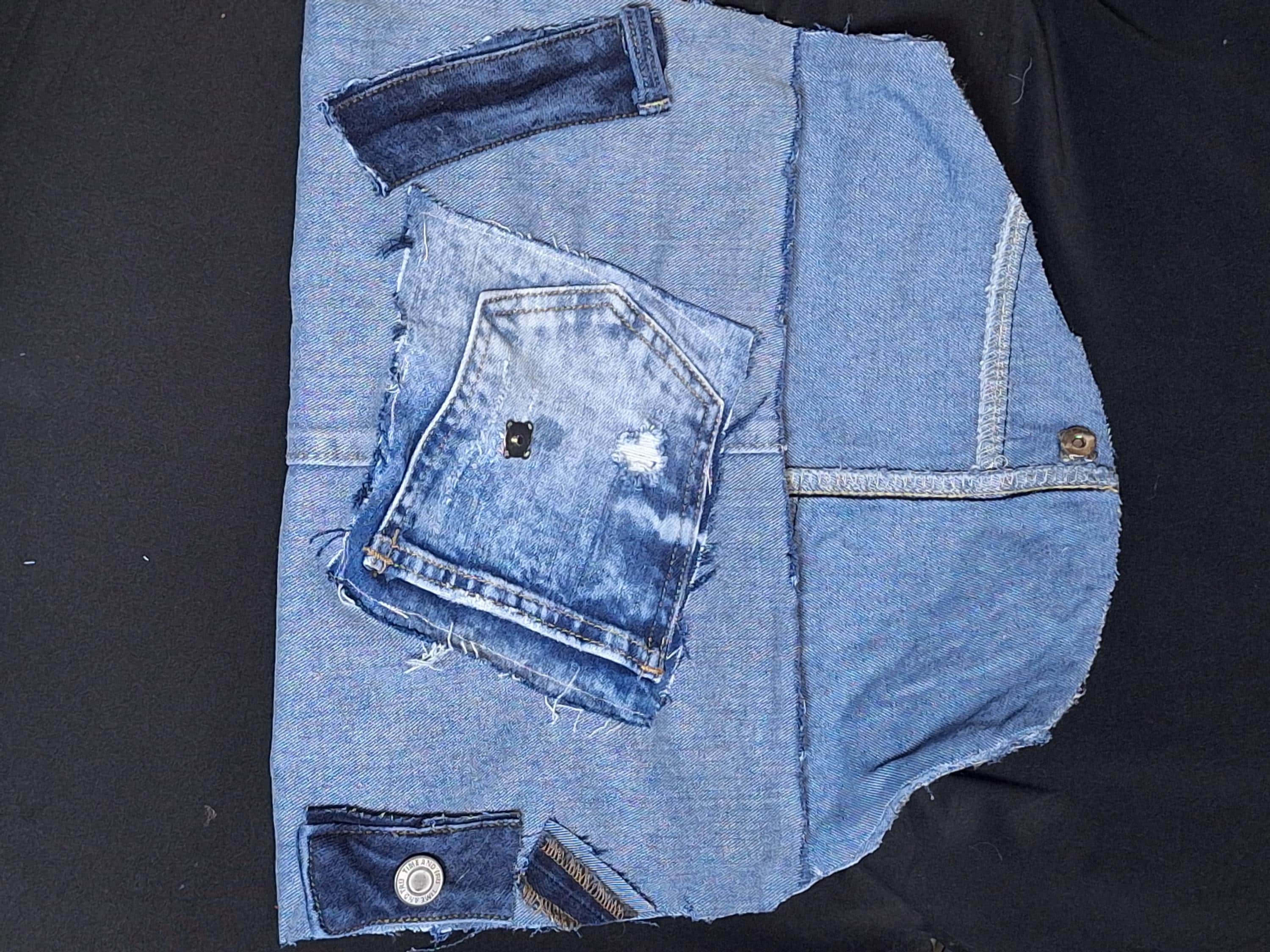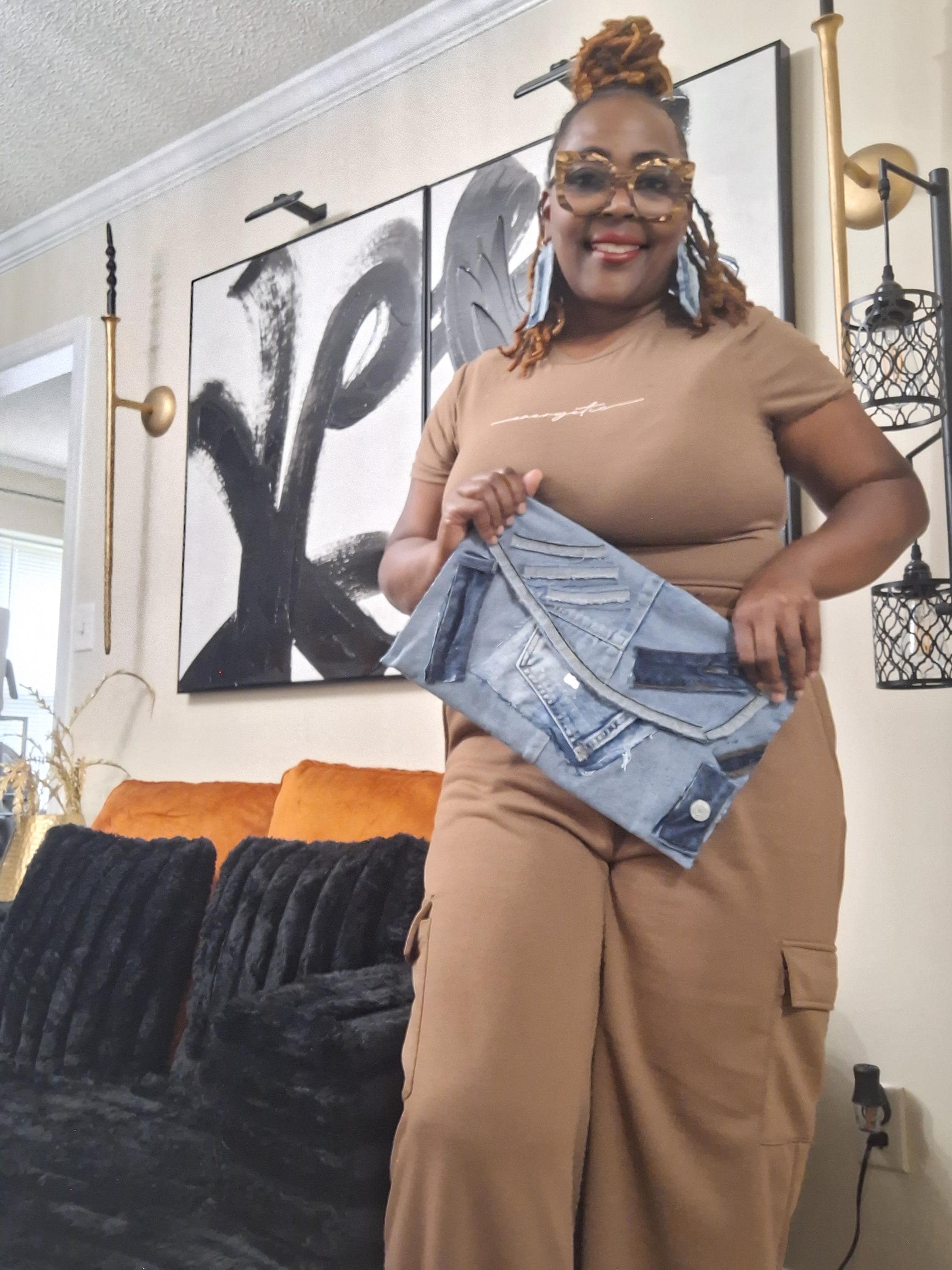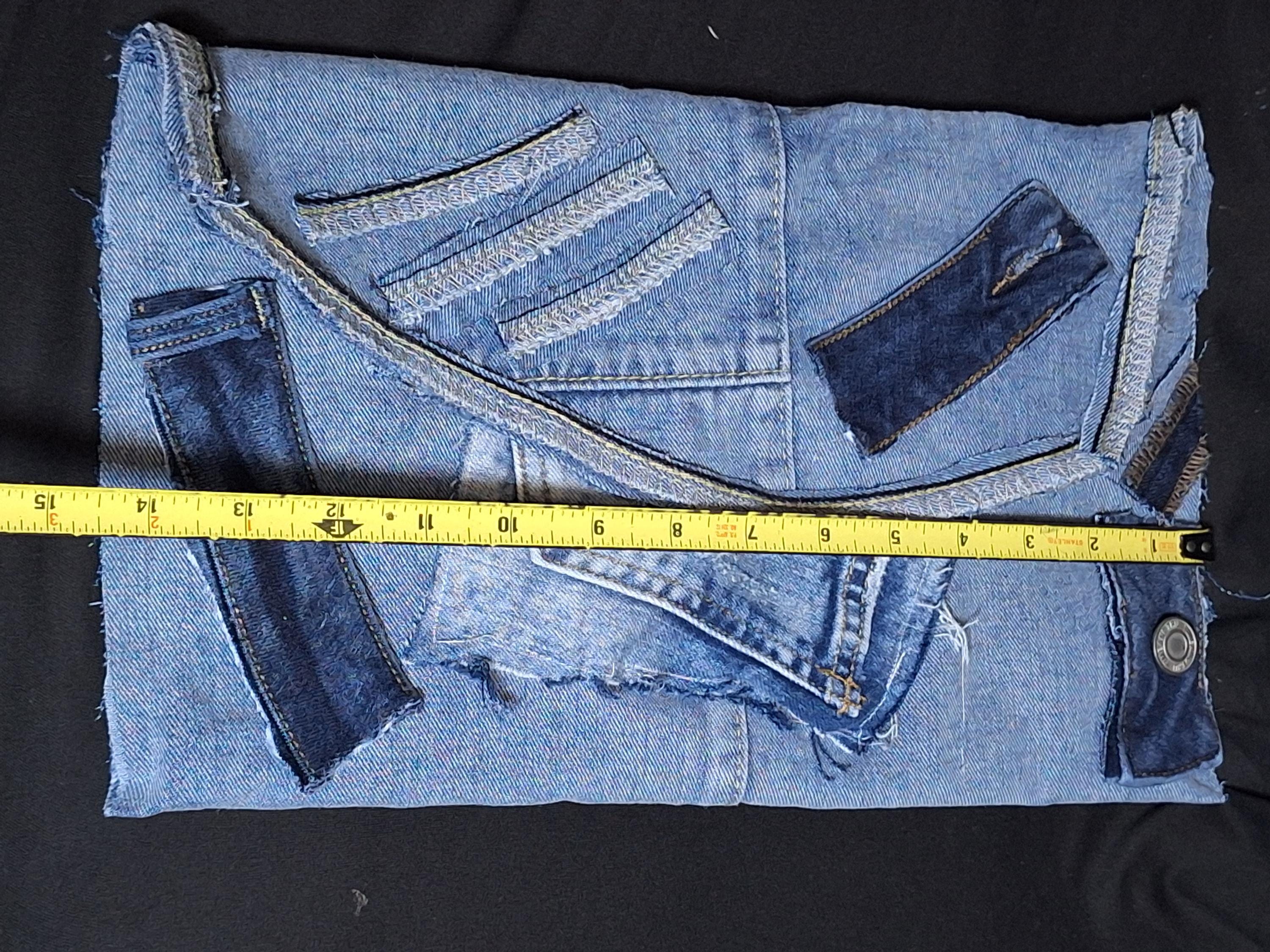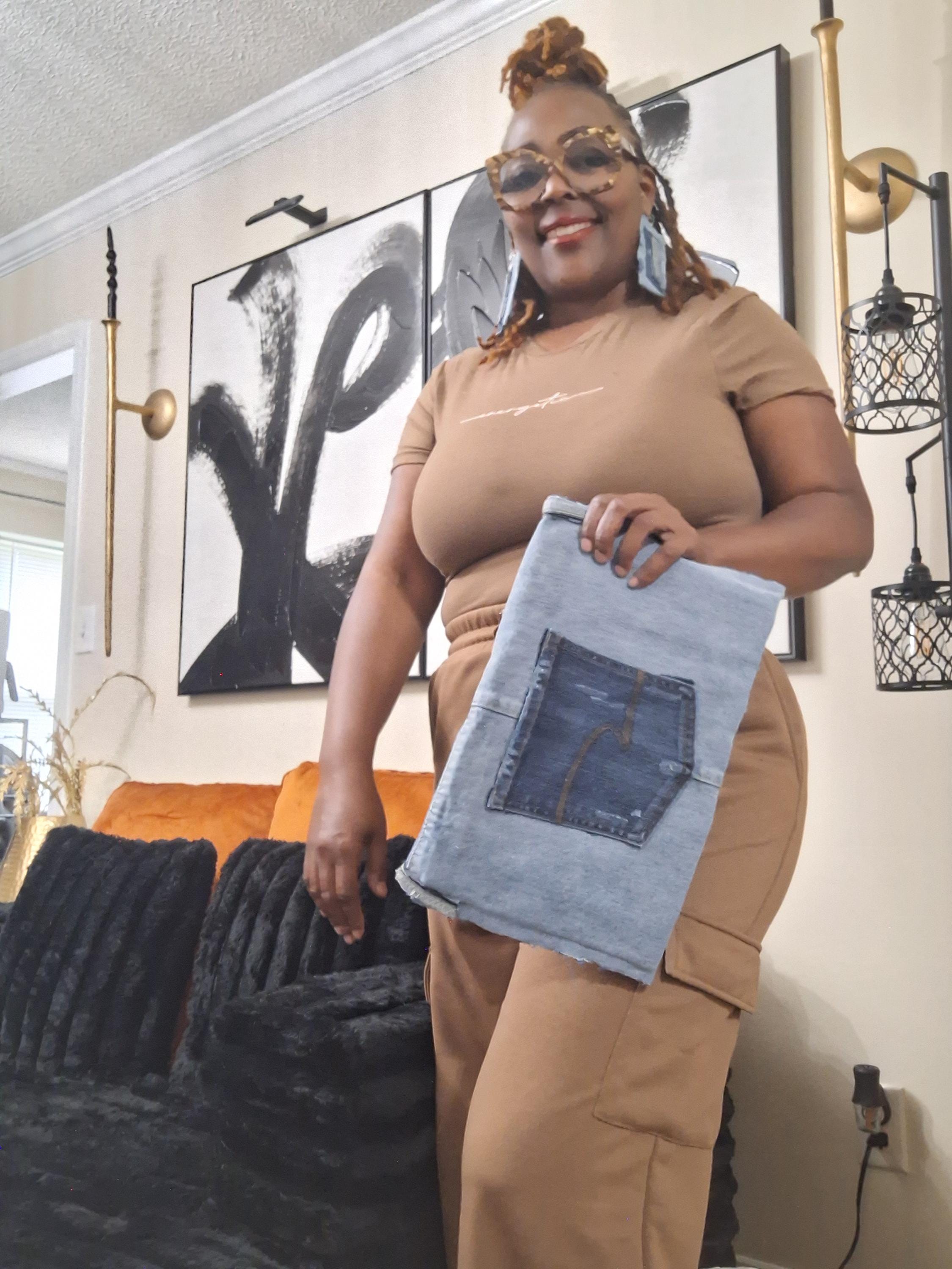 This is a handmade denim mixed, upcycled clutch. It is made using bleached denim jeans with matching dangle earrings incuded.