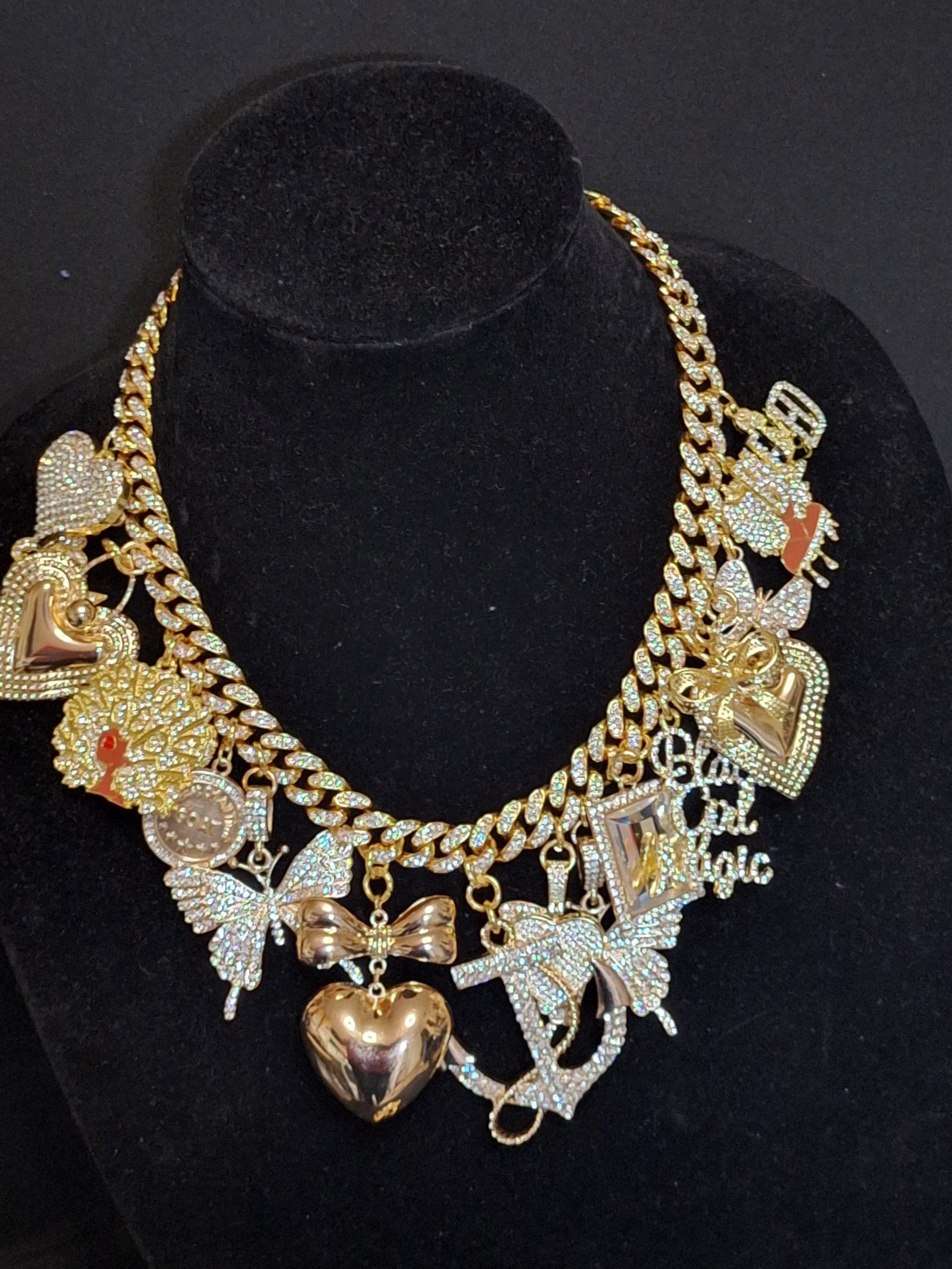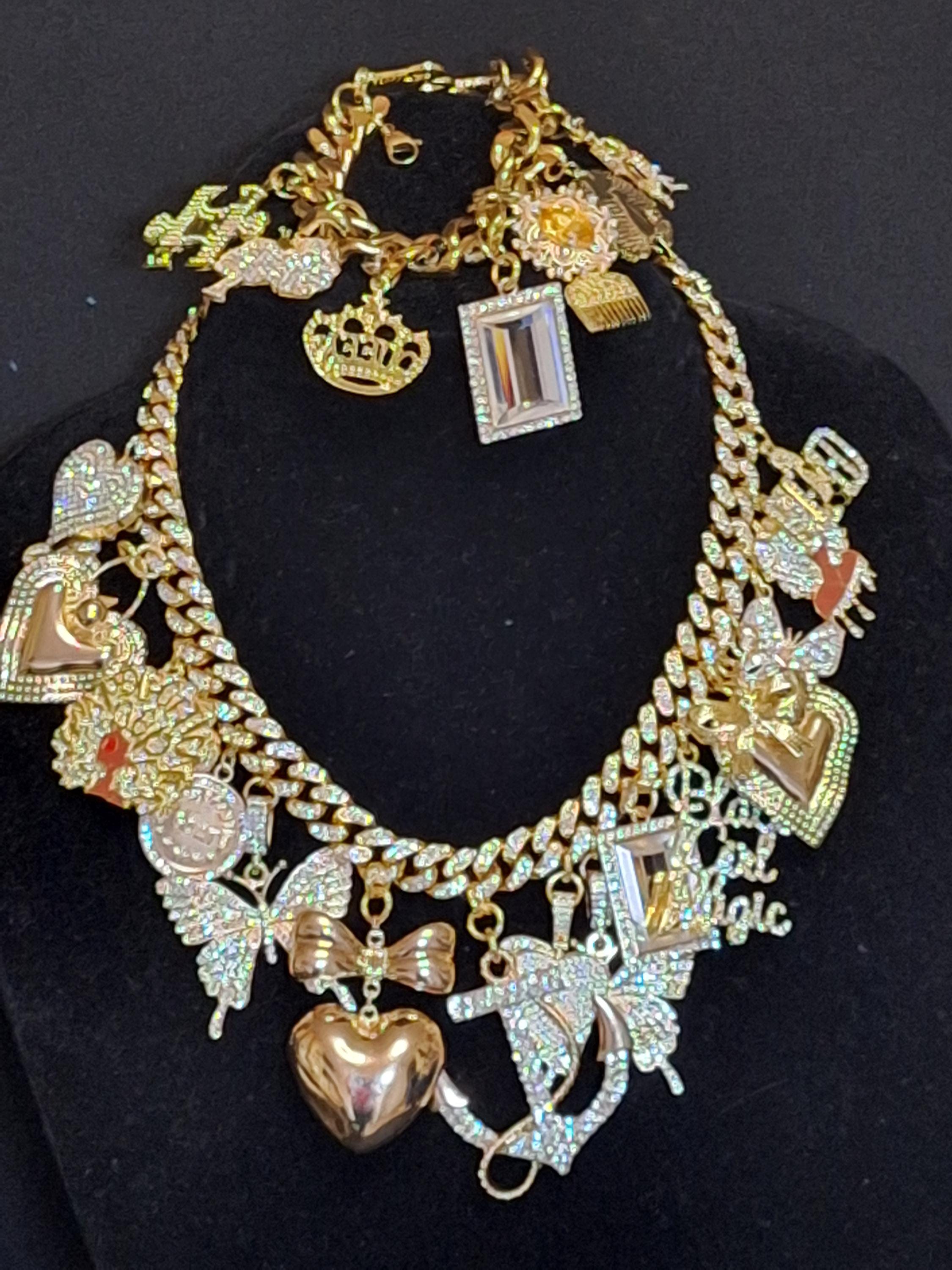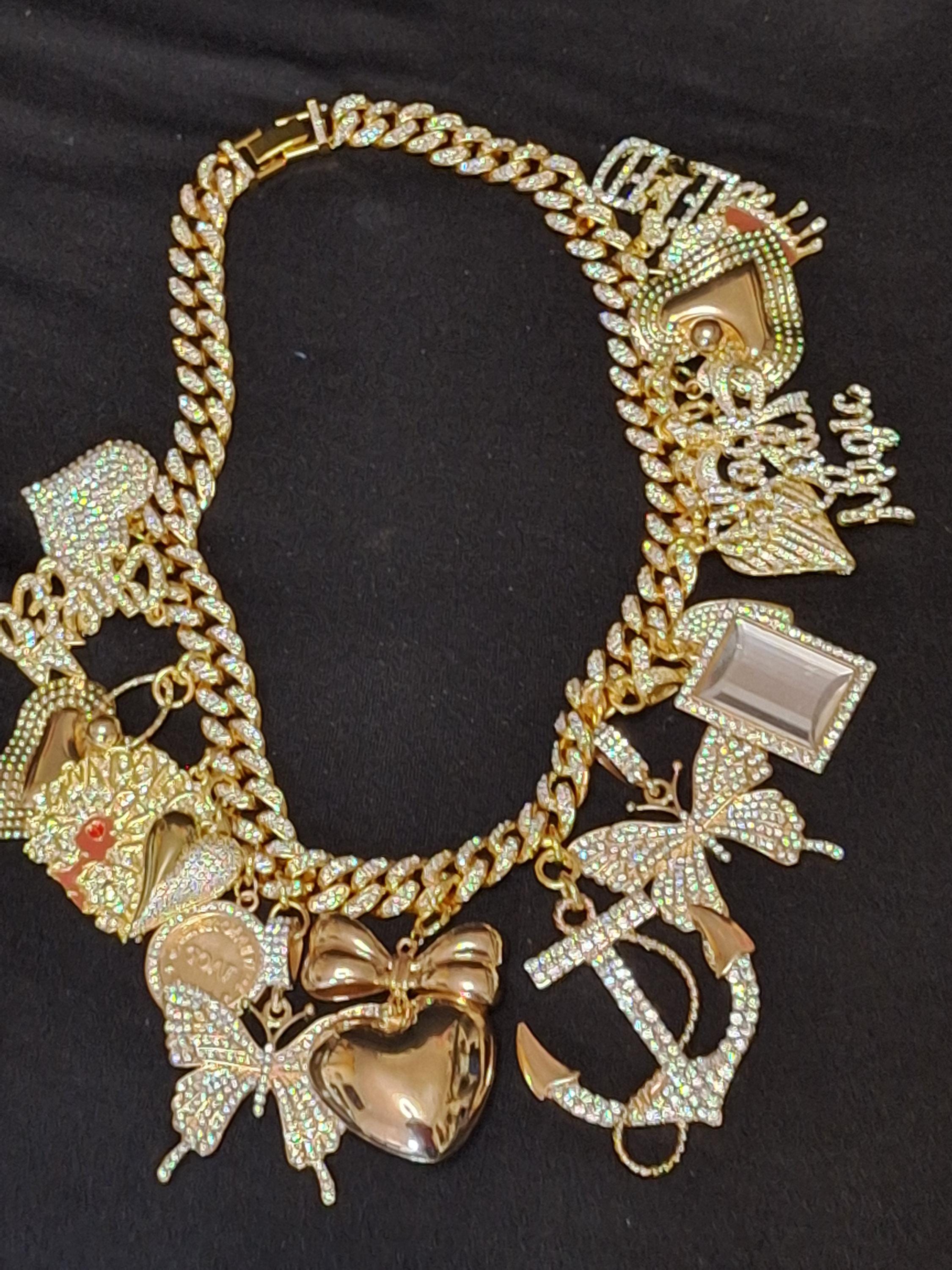 Necklace length: Gold Ice 16 inches with multiple gold plated charms.