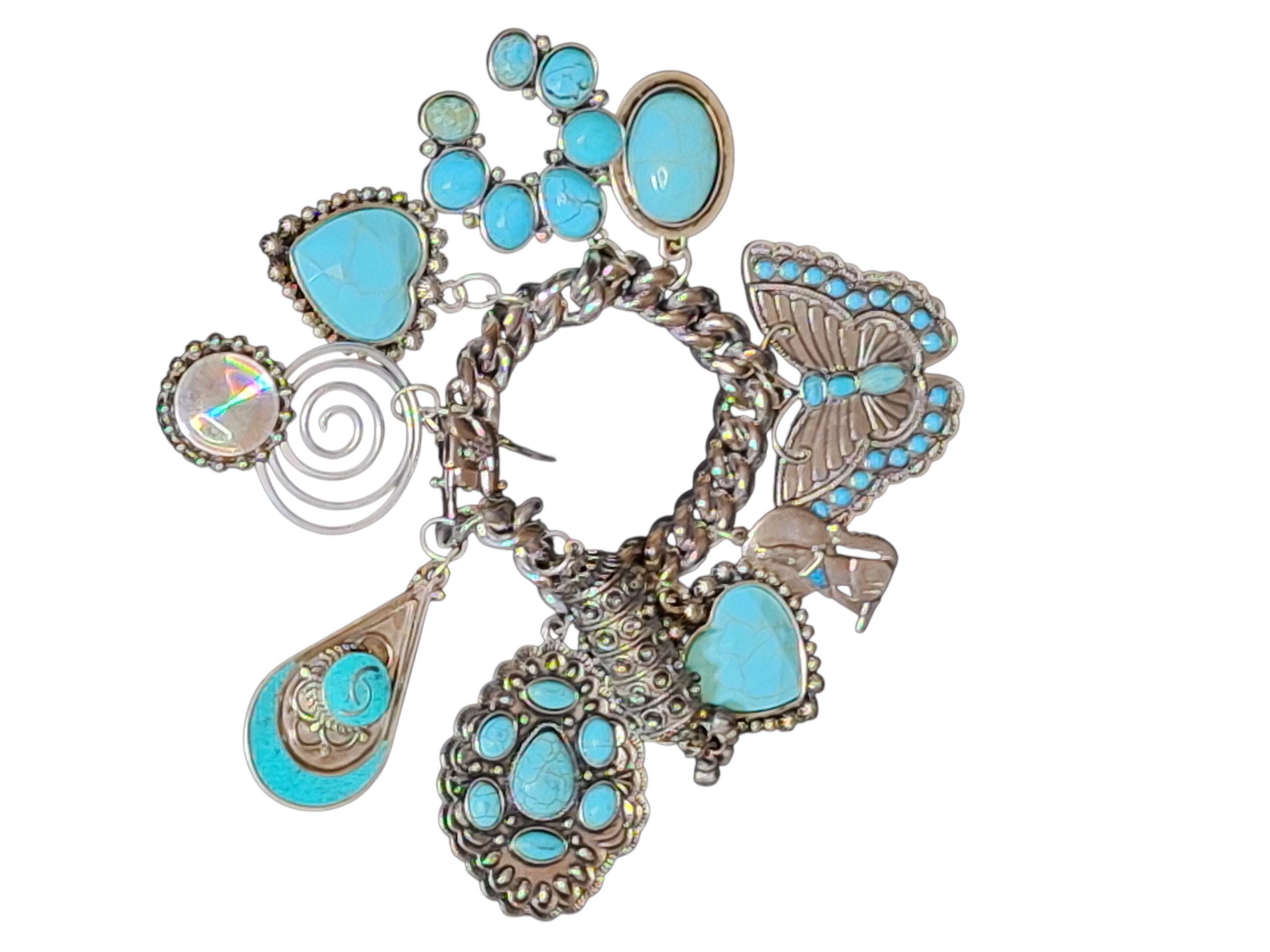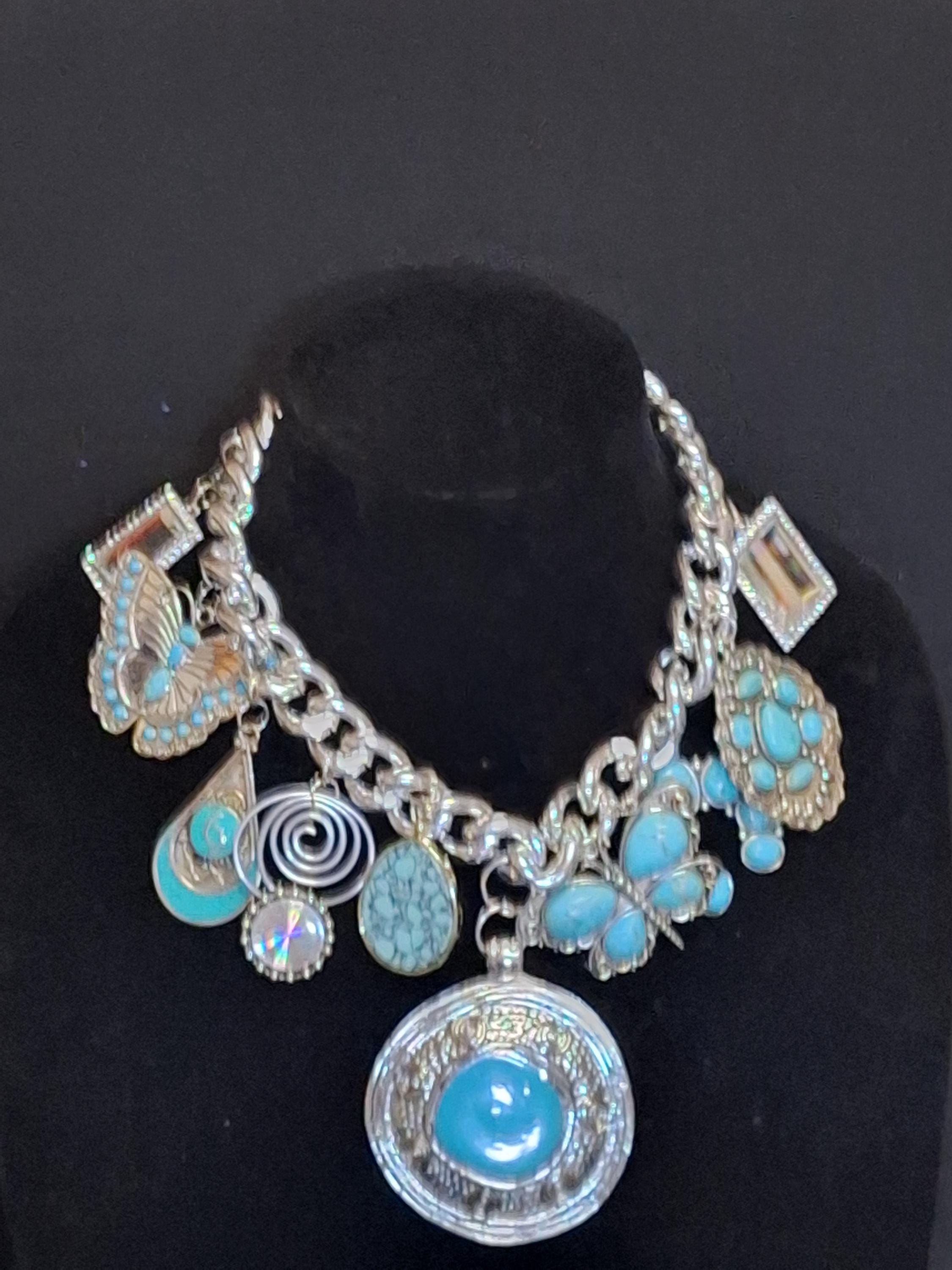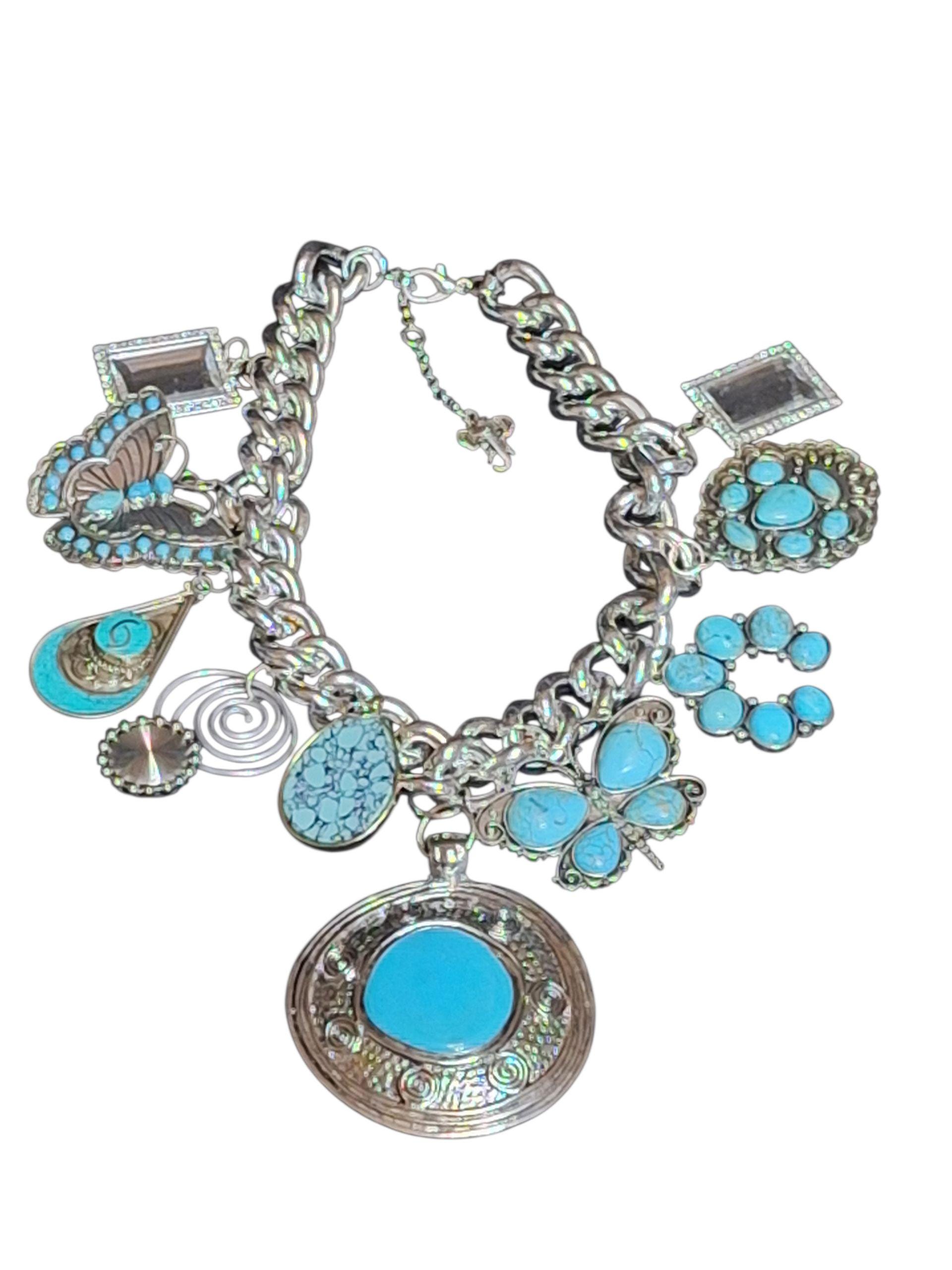 Western Style Junk Turquoise and Silver Plated Charm Necklace and bracelet set, Western Charm Statement Necklace with matching bracelet