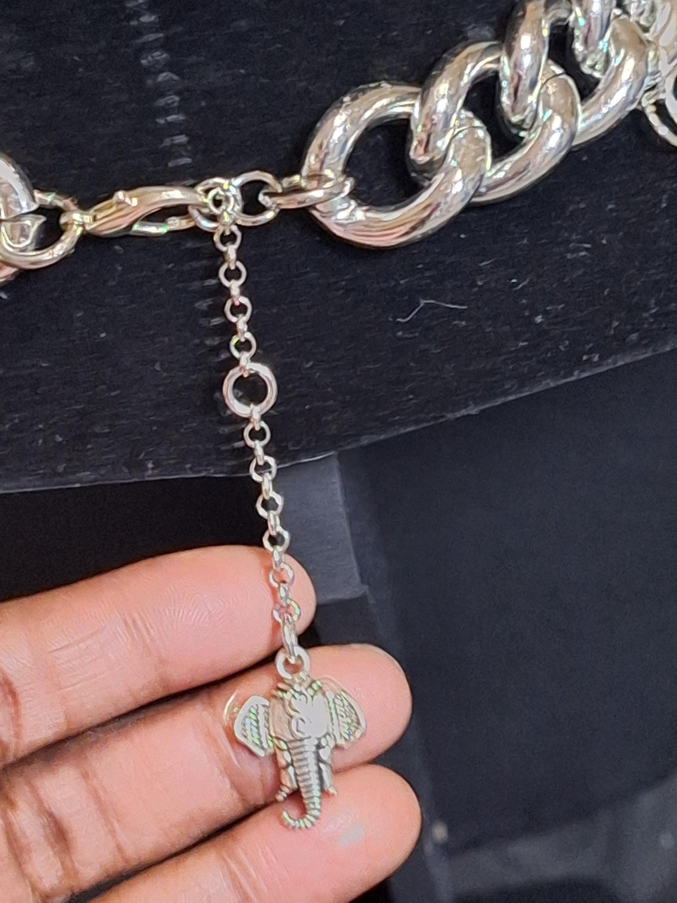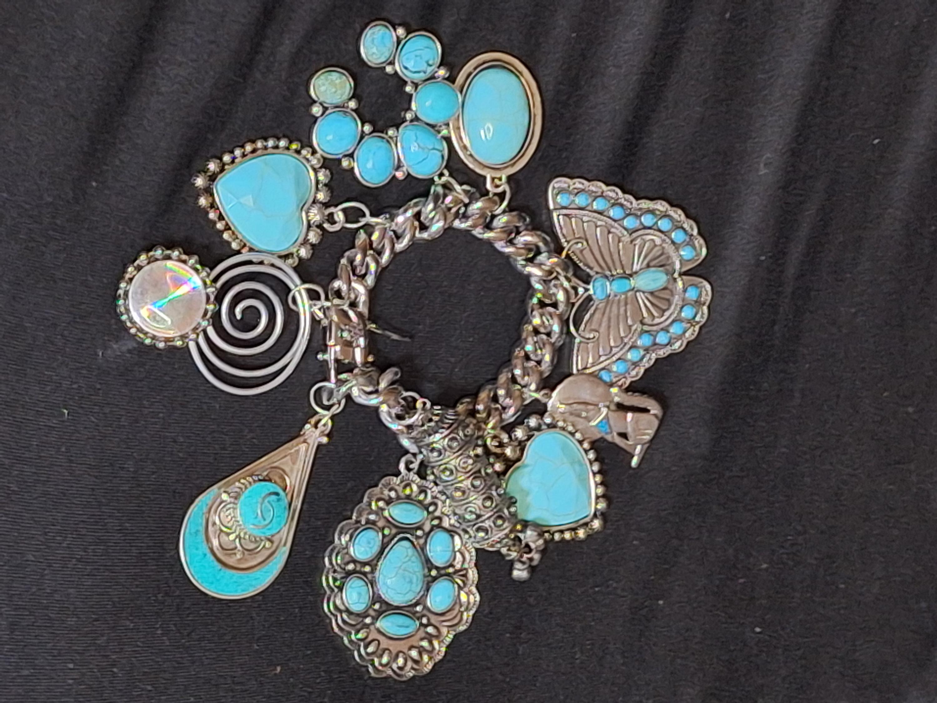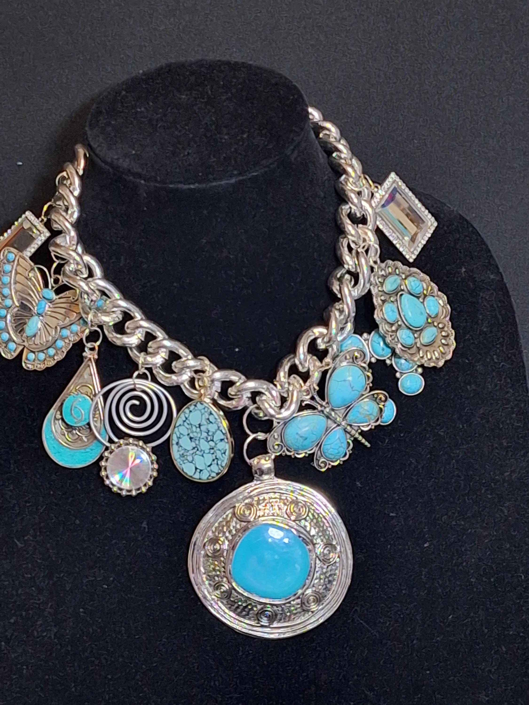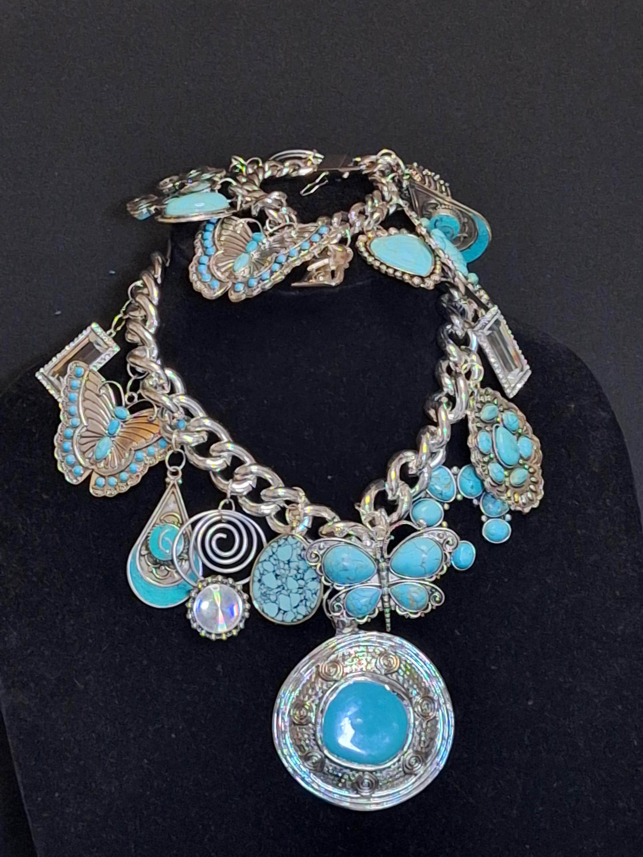 Western Style Junk Turquoise and Silver Plated Charm Necklace and bracelet set, Western Charm Statement Necklace with matching bracelet