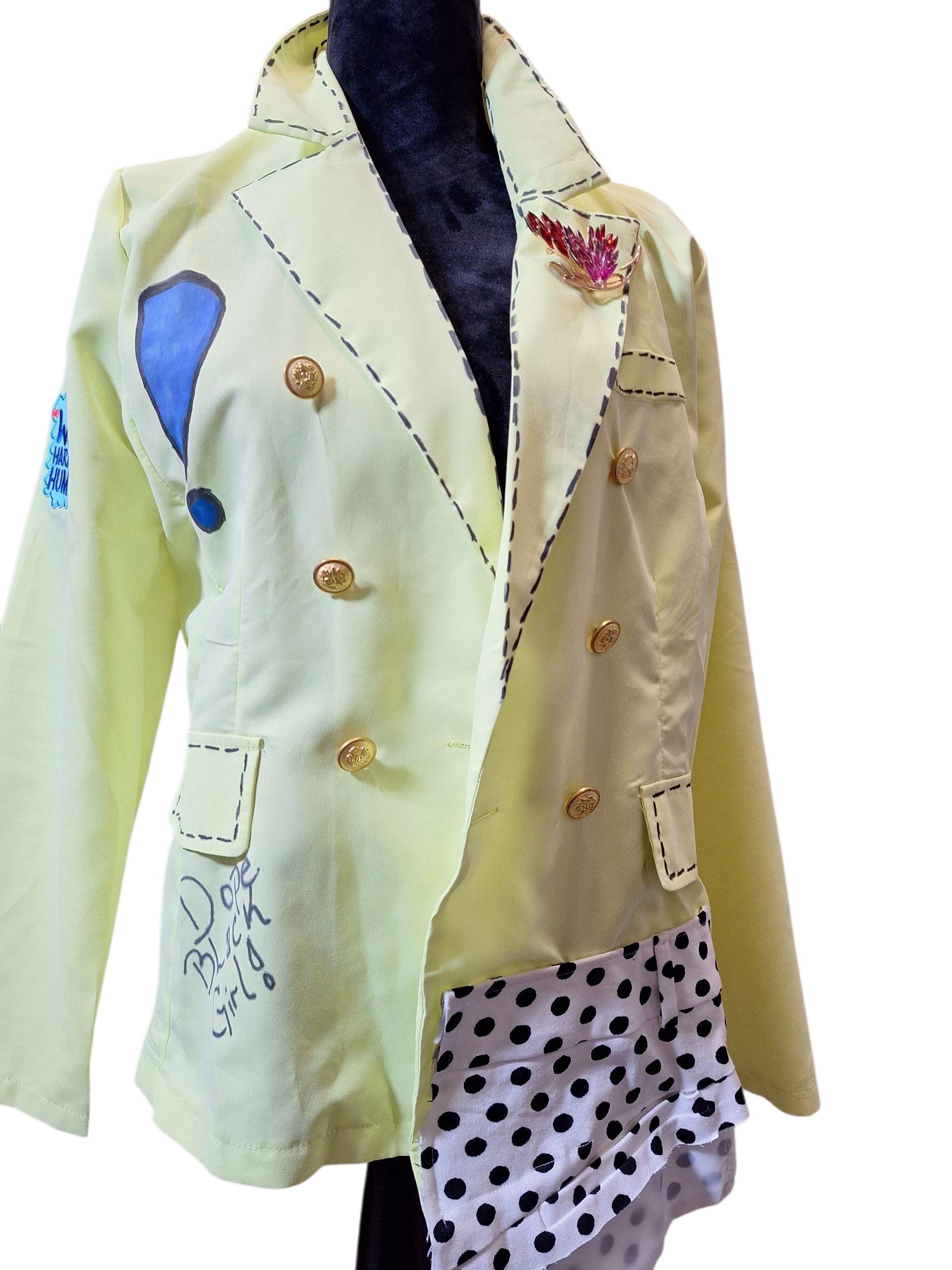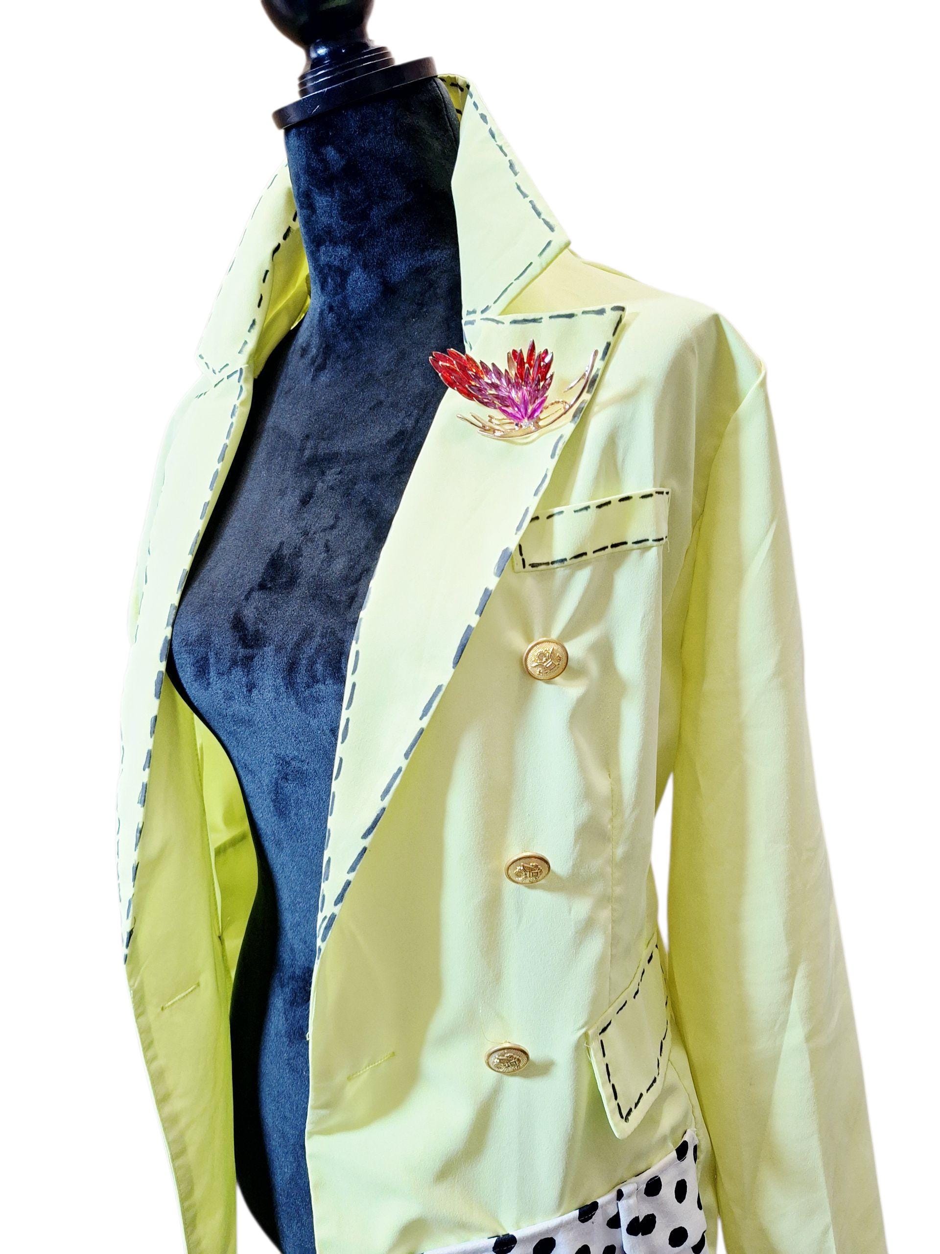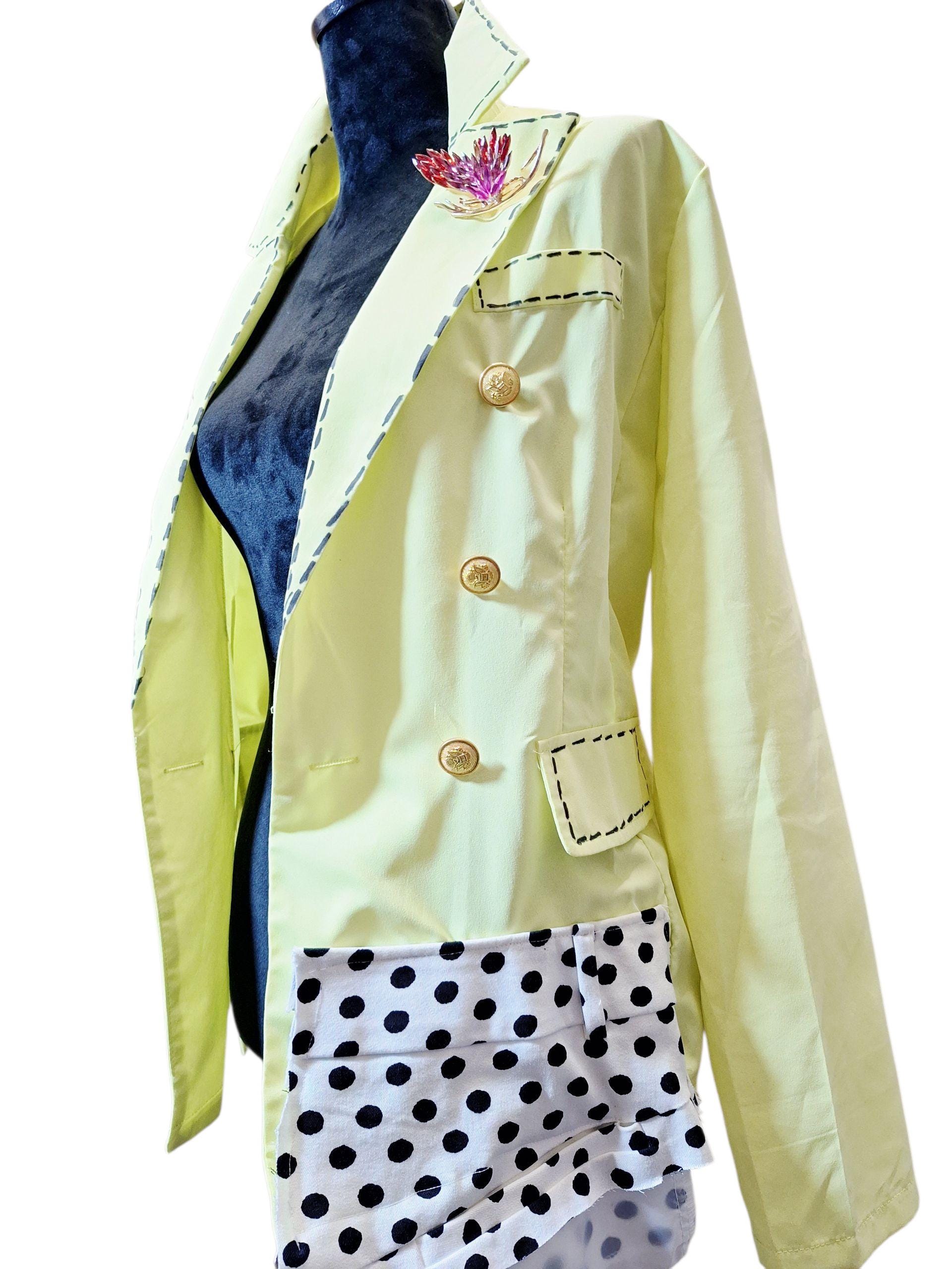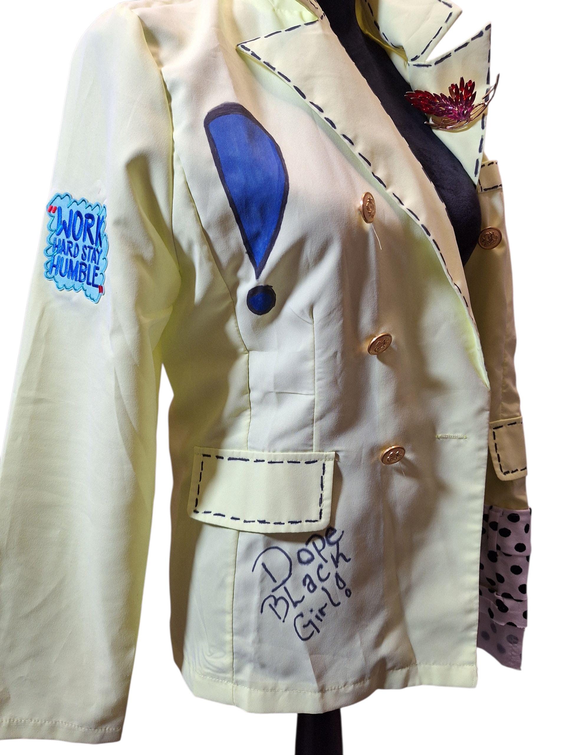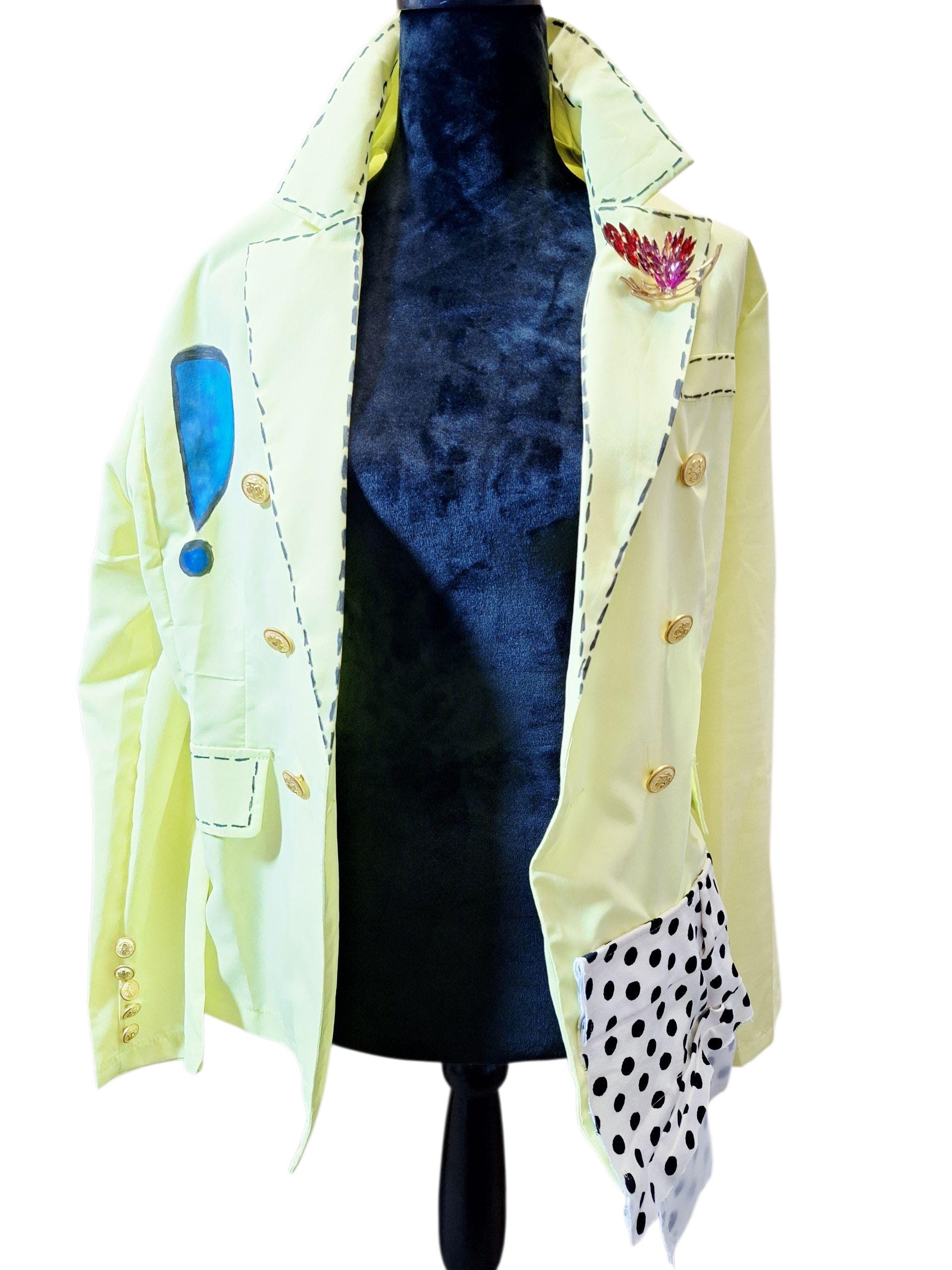 This is a upcycled and revamped sleeveless one of a kind blazer. It is made using hand sewn denim pieces and various patches with hand drawn designs.
