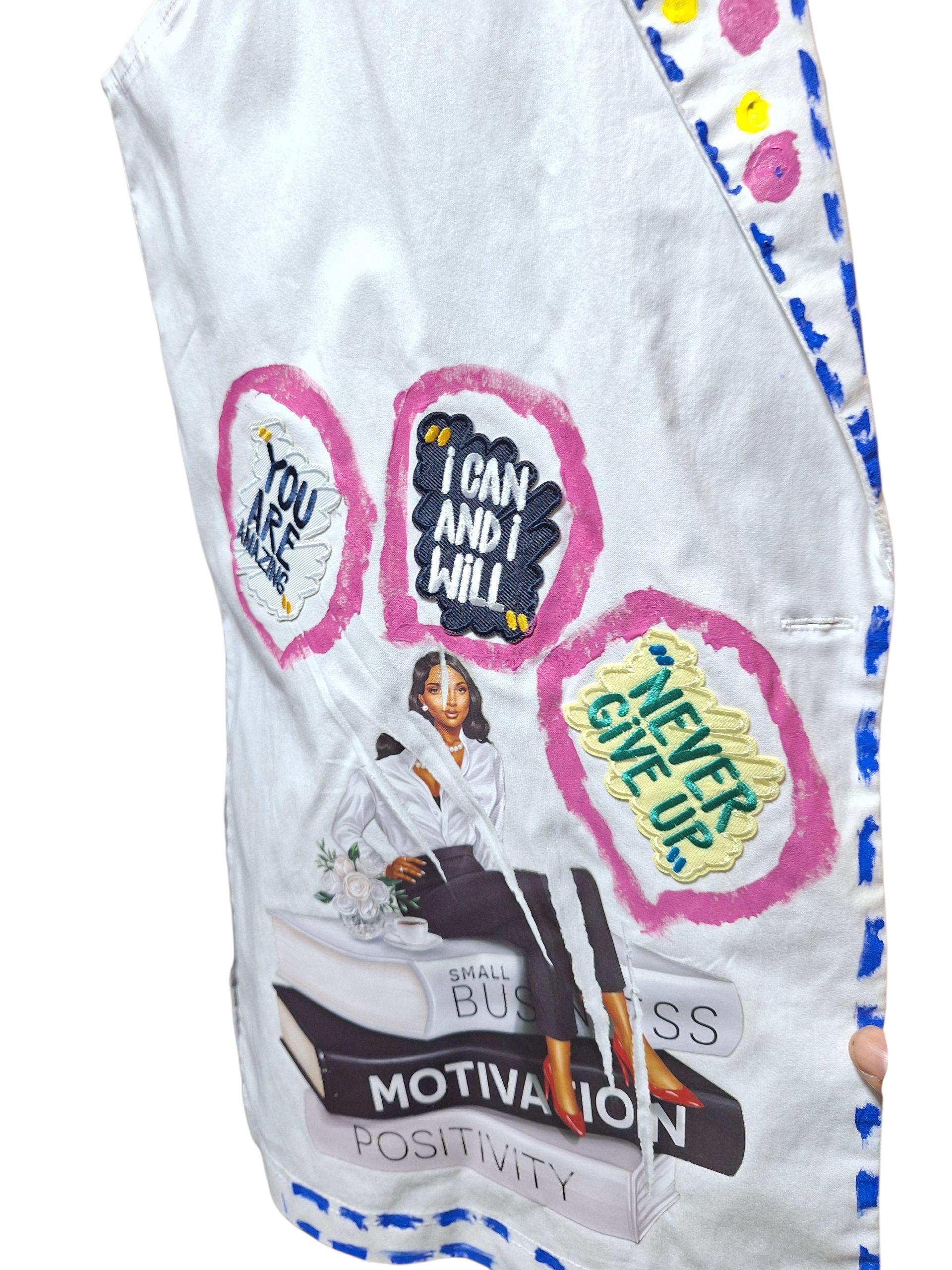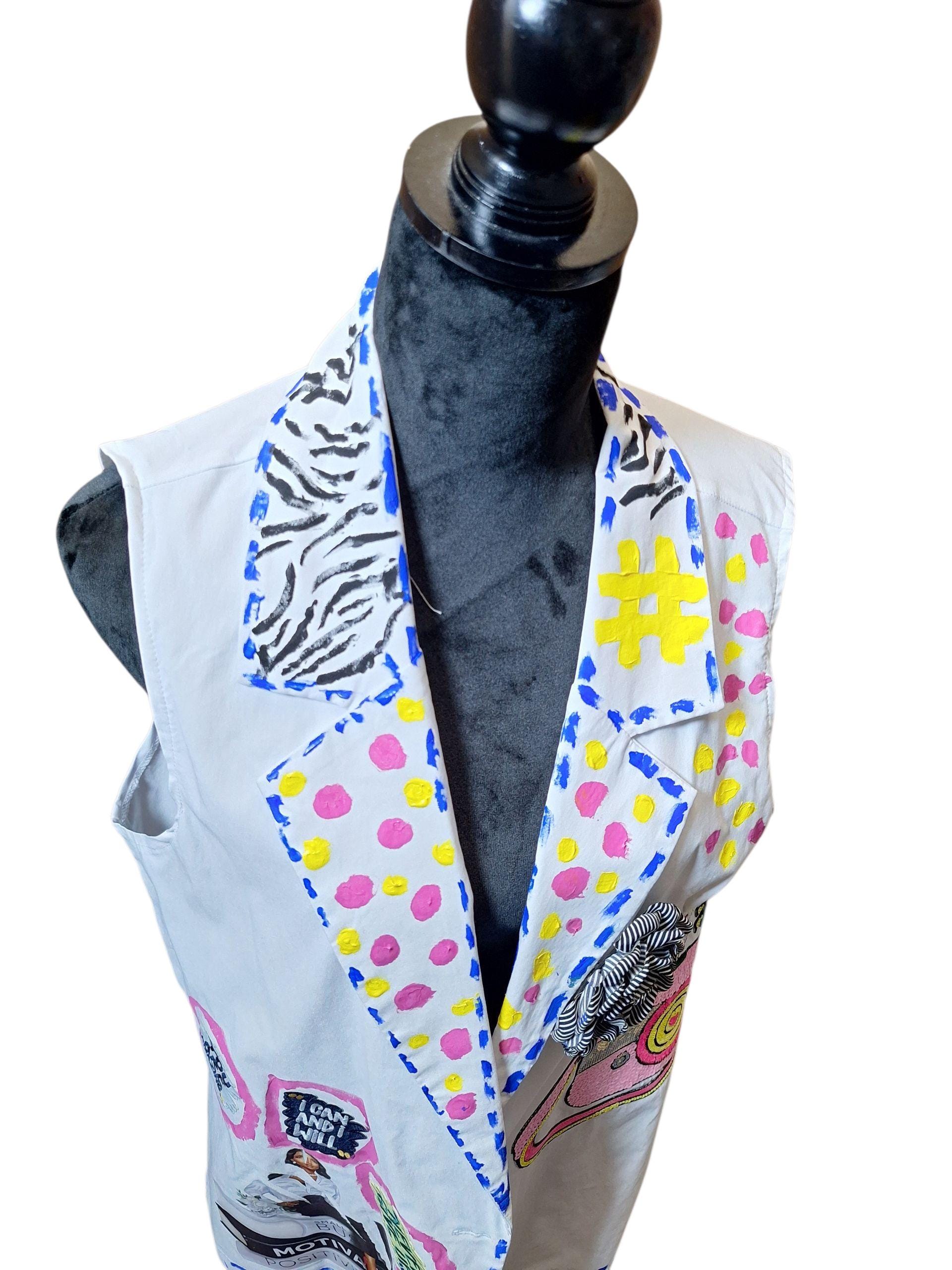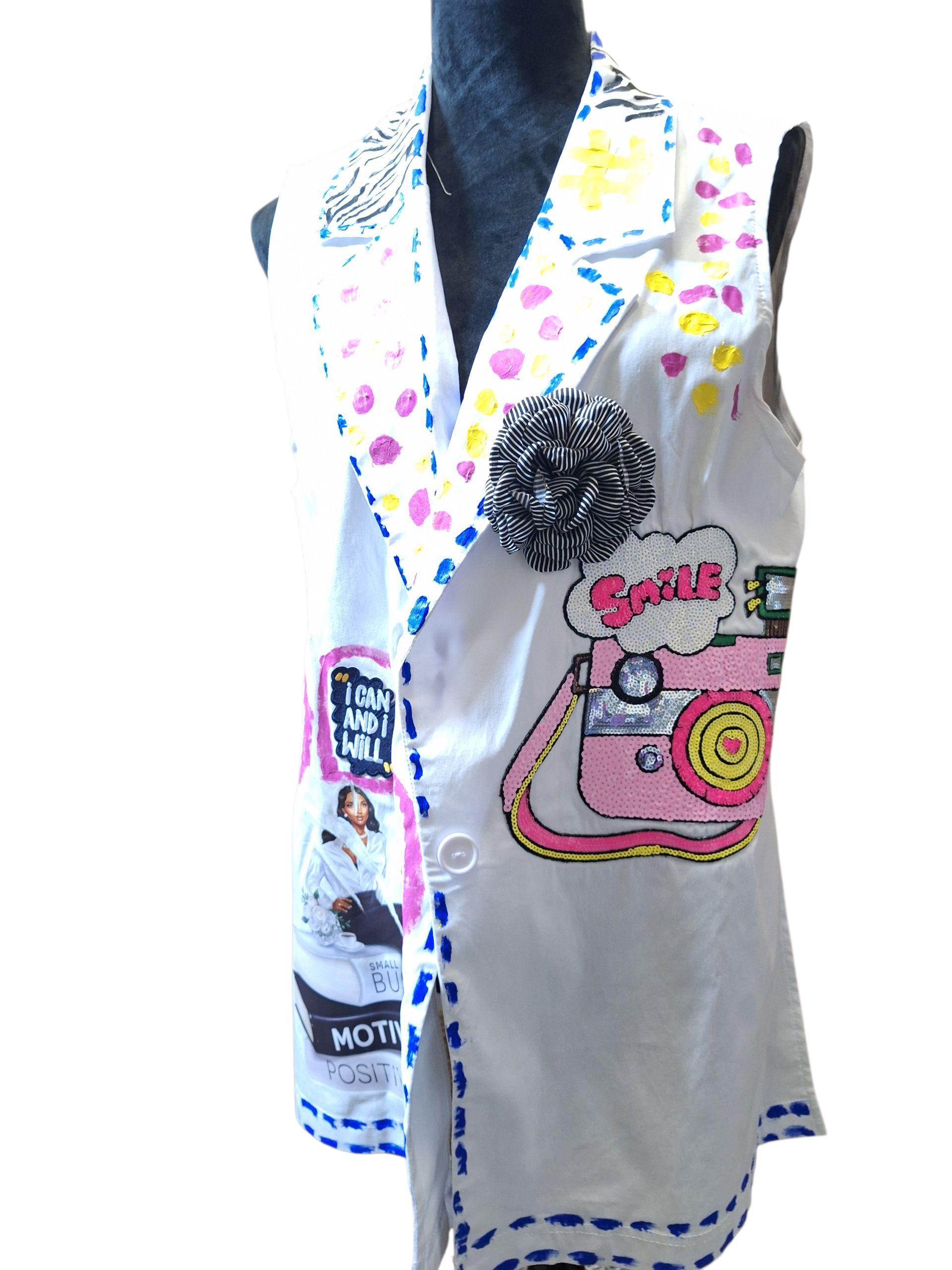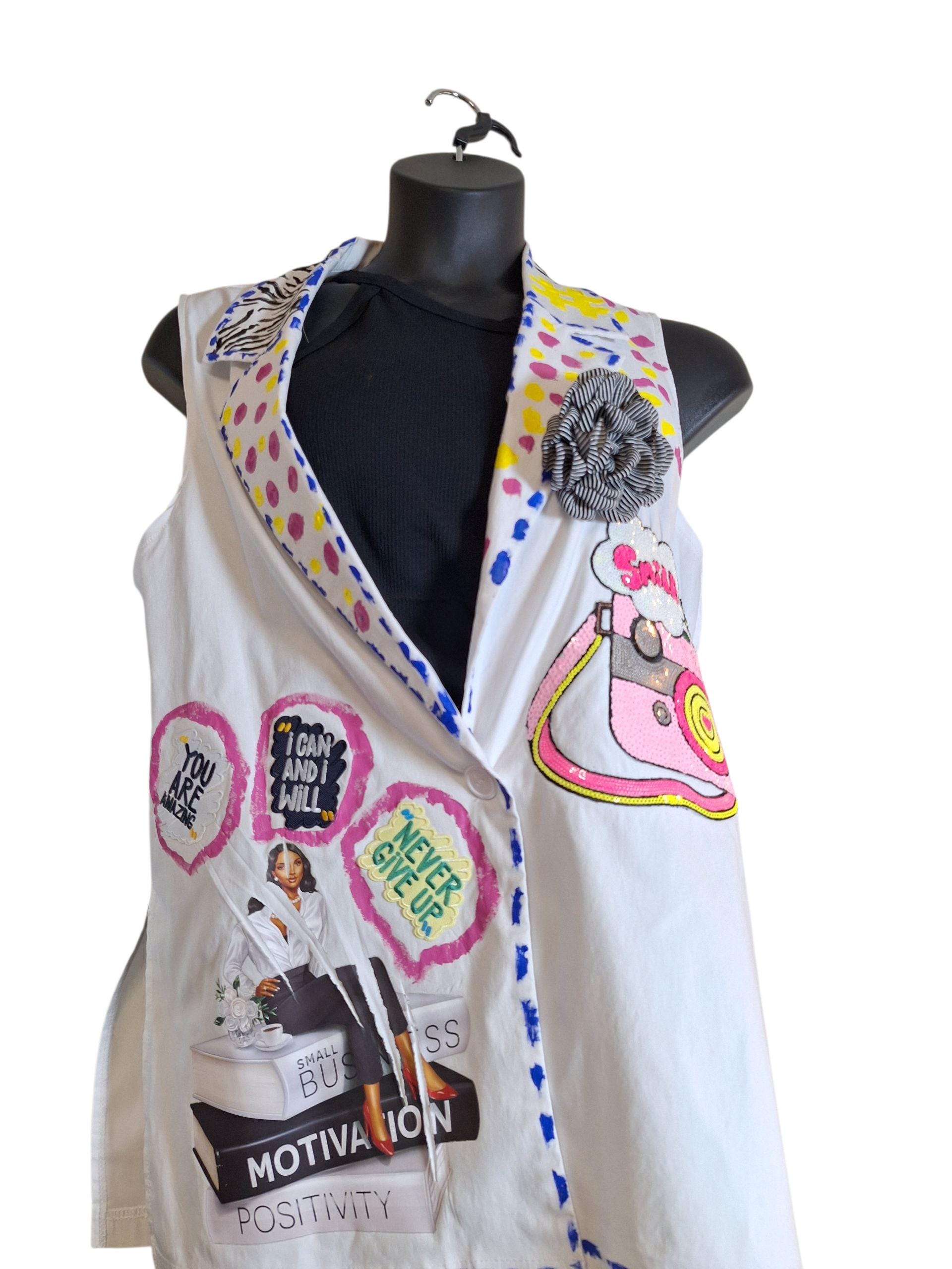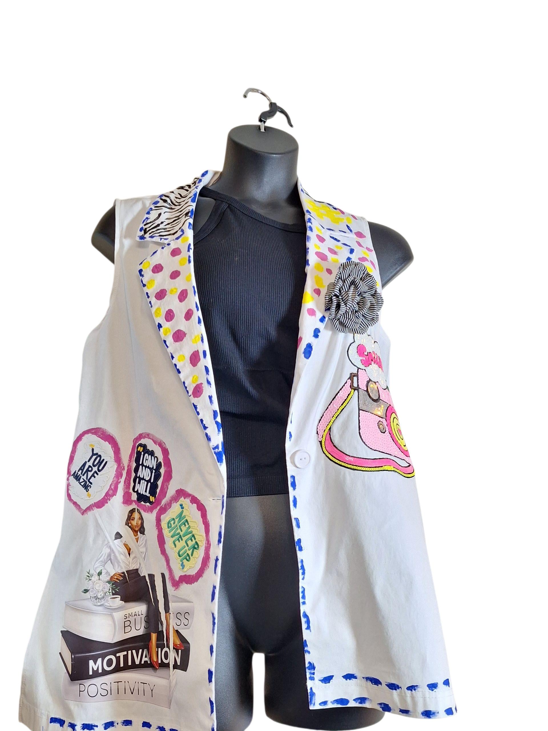 This is a upcycled and revamped sleeveless one of a kind blazer. It is made using hand sewn denim pieces and various patches.